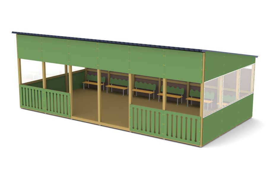В данной категории представлены универсальные конструкции для защиты от солнца и дождя. Промежутки и стыки между элементами оборудования разработаны так, чтобы не допустить застревания конечностей, туловища и головы ребёнка, при этом конструкция не даст ему перевернуться или выпасть. Проработана возможность доступа взрослого при обстоятельствах, требующих посторонней помощи ребёнку.