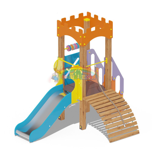 Комплекс детский Крепость представляет собой яркую горку с крышей, выполненной в виде башни крепости и дополненный игровыми элементами в виде цветных колечек-счетов и скалодромом с канатом для малышей. Интересный дизайн этого комплекса порадует малышей и украсит собой любую детскую игровую площадку. Детки с удовольствием будут играть и активно проводить время с таким занимательным детским комплексом.
