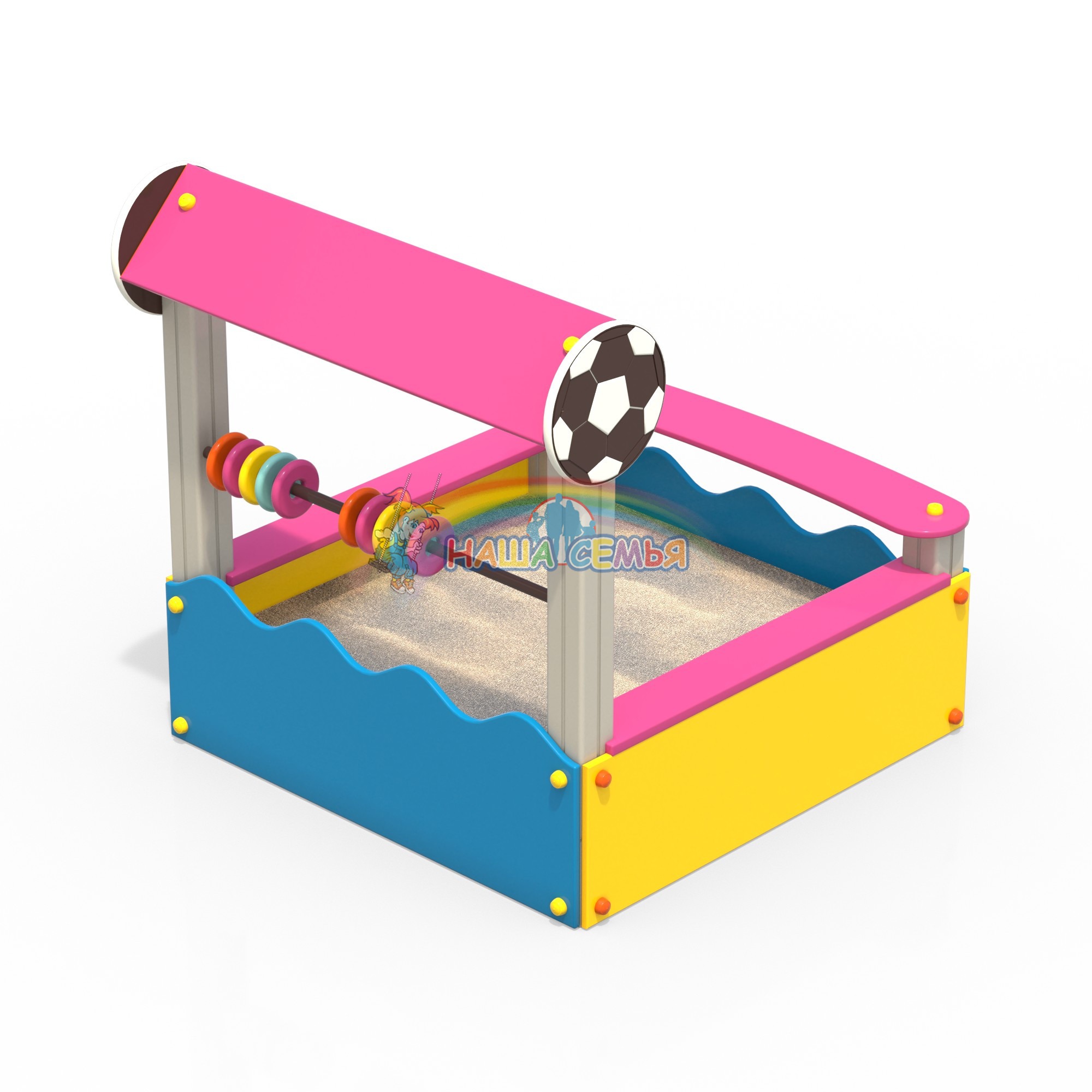 Песочница Футбол. Песочница раскрашена в яркие цвета. Добавлен игровой элемент в виде колец-счетов. По периметру расположены места для сидения. Песочница декорирована элементами в виде футбольных мячей. Эта песочница несомненно понравится ребятам.