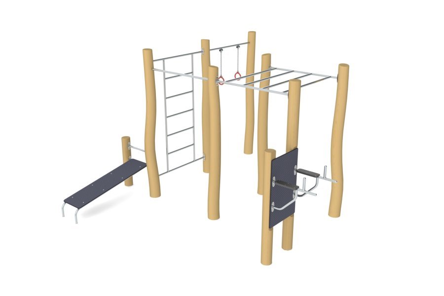 В данной категории представлено оборудование для занятия активным спортом (опорные стойки из древесины). Промежутки и стыки между элементами оборудования разработаны так, чтобы не допустить застревания конечностей, туловища и головы ребёнка, при этом конструкция не даст ему перевернуться или выпасть. Проработана возможность доступа взрослого при обстоятельствах, требующих посторонней помощи ребёнку.