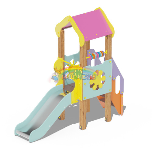 Комплекс детский представляет собой домик с горкой, дополненный цветными колечками-счетами. Предназначен для самых маленьких детей. Яркий дизайн этого комплекса украсит любую детскую игровую площадку и привлечет к себе внимание детишек. Он станет любимым аттракционом малышей.