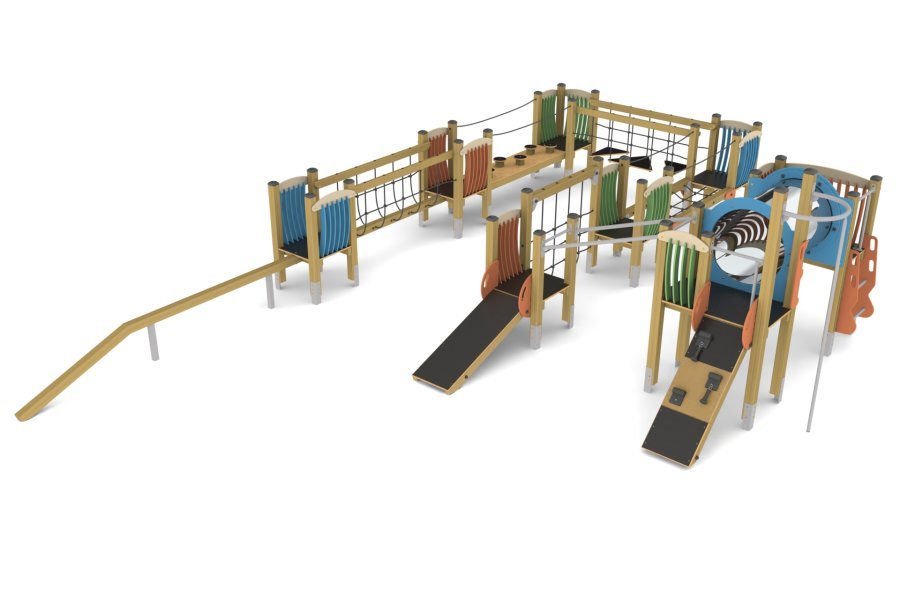 This category features small and medium-sized play structures for children aged 7 to 14. The gaps and joints between the equipment elements are designed to prevent a child's limbs, torso, and head from becoming entangled, while the structure also prevents tipping or falling out. Adult access is also provided in situations requiring assistance.