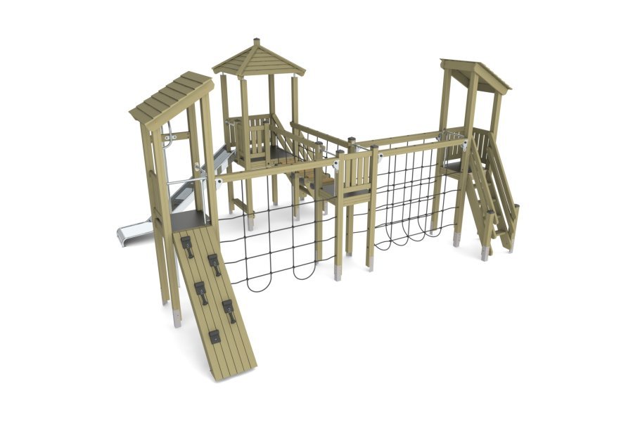 This category features small and medium-sized wooden play structures for children aged 7 to 14. These structures perfectly combine the texture of pine wood and stainless steel. The equipment is made from highly durable and weather-resistant materials: stainless steel, and all wooden elements have a protective coating.