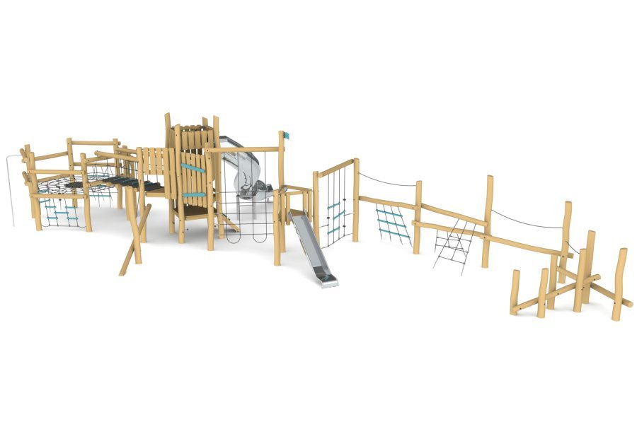 Small and medium-sized wooden play structures for children aged 7 to 14. These structures are multifunctional, environmentally friendly, durable, and safe. The equipment is made from highly durable and weather-resistant materials, including black locust wood, stainless steel, and composite ropes.