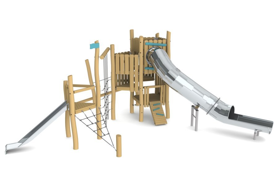 Small and medium-sized wooden play structures for children aged 7 to 14. These structures are multifunctional, environmentally friendly, durable, and safe. The equipment is made from highly durable and weather-resistant materials, including black locust wood, stainless steel, and composite ropes.