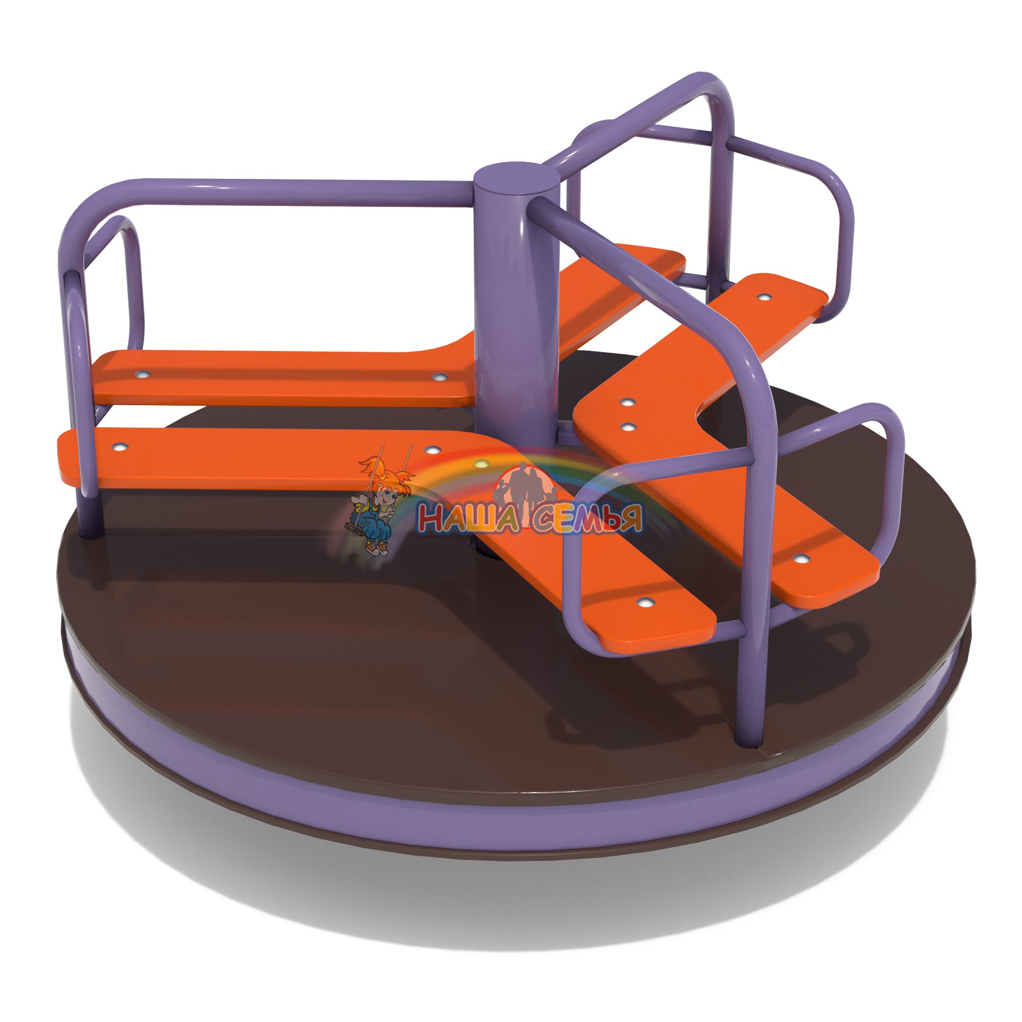 У этой карусели, коричневое основание, фиолетовые металлические поручни и оранжевые сидения, на которых могут разместиться сразу несколько детей. Дети смогут весело проводить на них свое свободное время. Эта карусель развивает координацию движений, укрепляет вестибулярный аппарат. Установка таких уличных каруселей на детской площадке или в детском саду, отличный способ организовать досуг ваших детей с пользой для их здоровья.