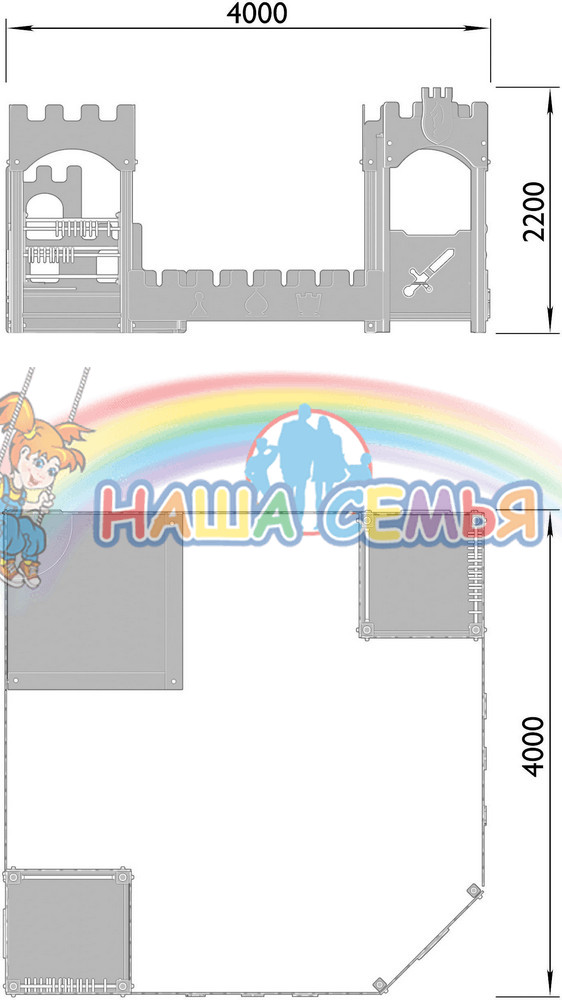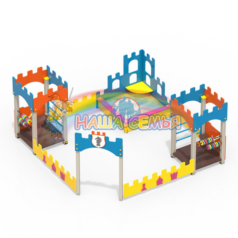 Песочный дворик Крепость состоит из игровых элементов разного характера: в нем есть песочница, лестницы для лазанья, разноцветные забавные счеты. Раскрашен песочный дворик в яркие цвета и декорирован элементами в виде крепости. Вход оформлен в виде входа в крепость. Такой красивый, оригинальный и интересный игровой комплекс с песочницей непременно понравится детям и впишется в любую детскую площадку: во дворе или детском саду.