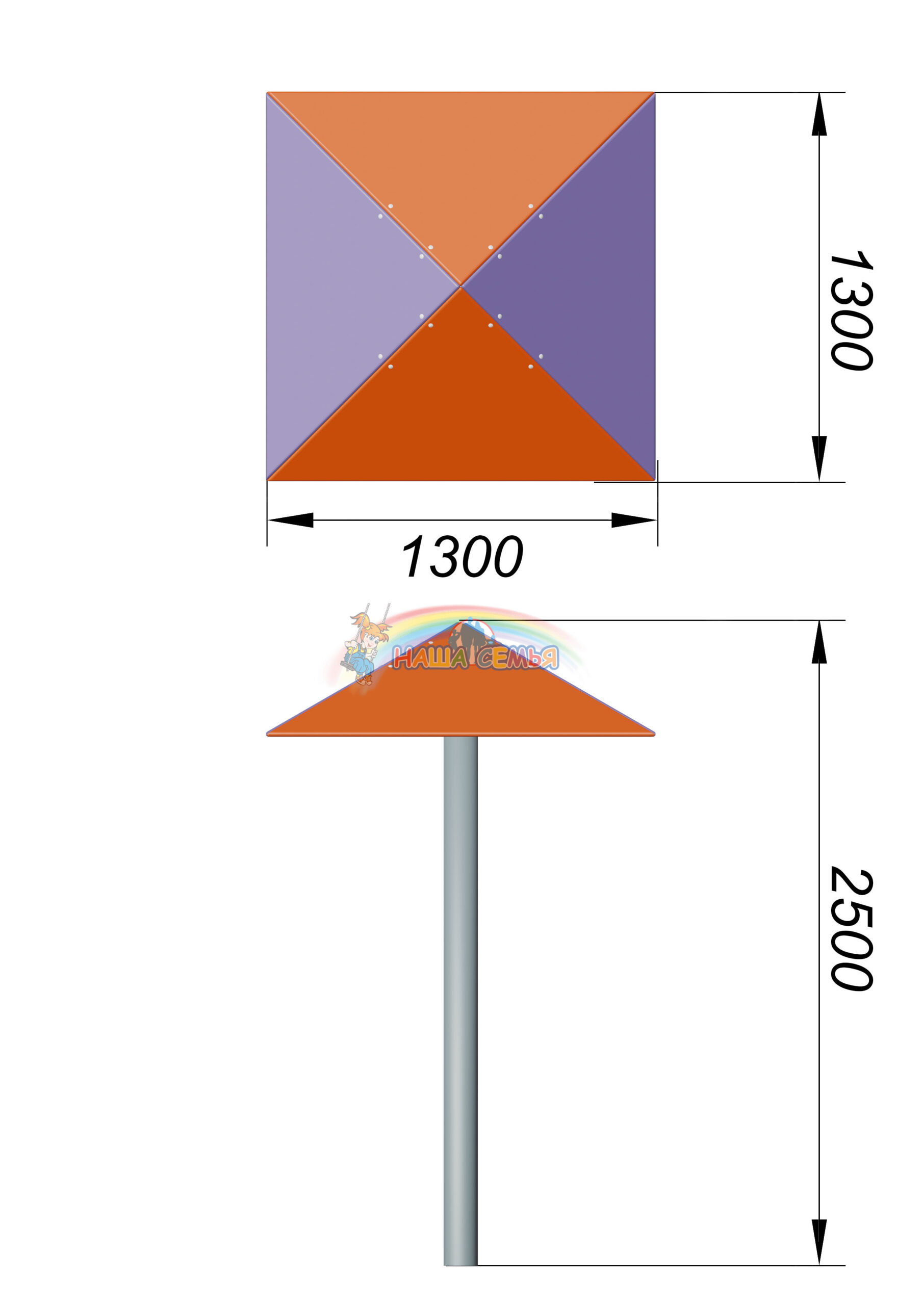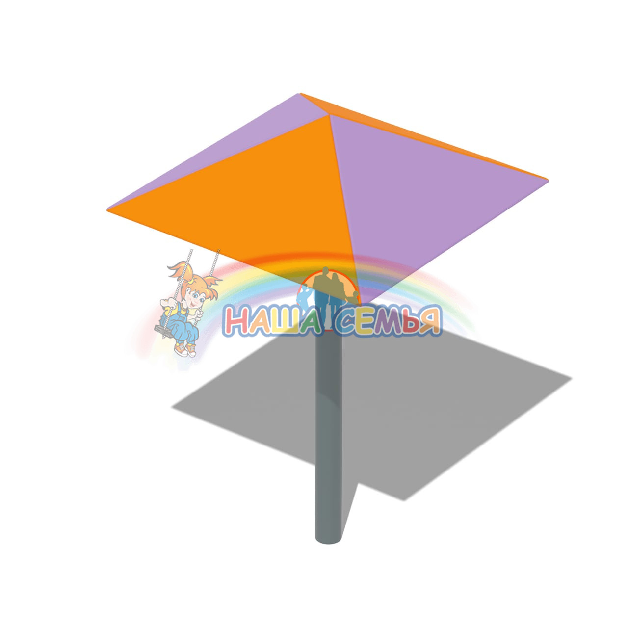 Зонтик теневой изготовлен из деревянных реек на металлическом каркасе. Устанавливается на детской игровой площадке в тех местах, где нужно притенить играющих детей: около песочниц, скамеек, столиков и т. д.. Основание окрашено порошковой краской в синий цвет.