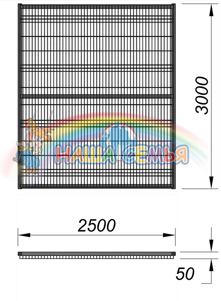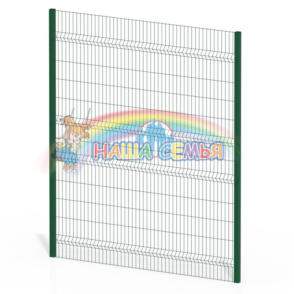 Ограждение (2500 х 3000) подходит для ограждения различных зон и участков, требующих ограждений с завышенной зоной: таких как, например, футбольное поле и т. д.. Выполнено из металла. Установлено на опорах с отсутствием нижнего просвета и покрашено порошковой зеленой краской. Имеет строгий простой дизайн без декоративных элементов.
