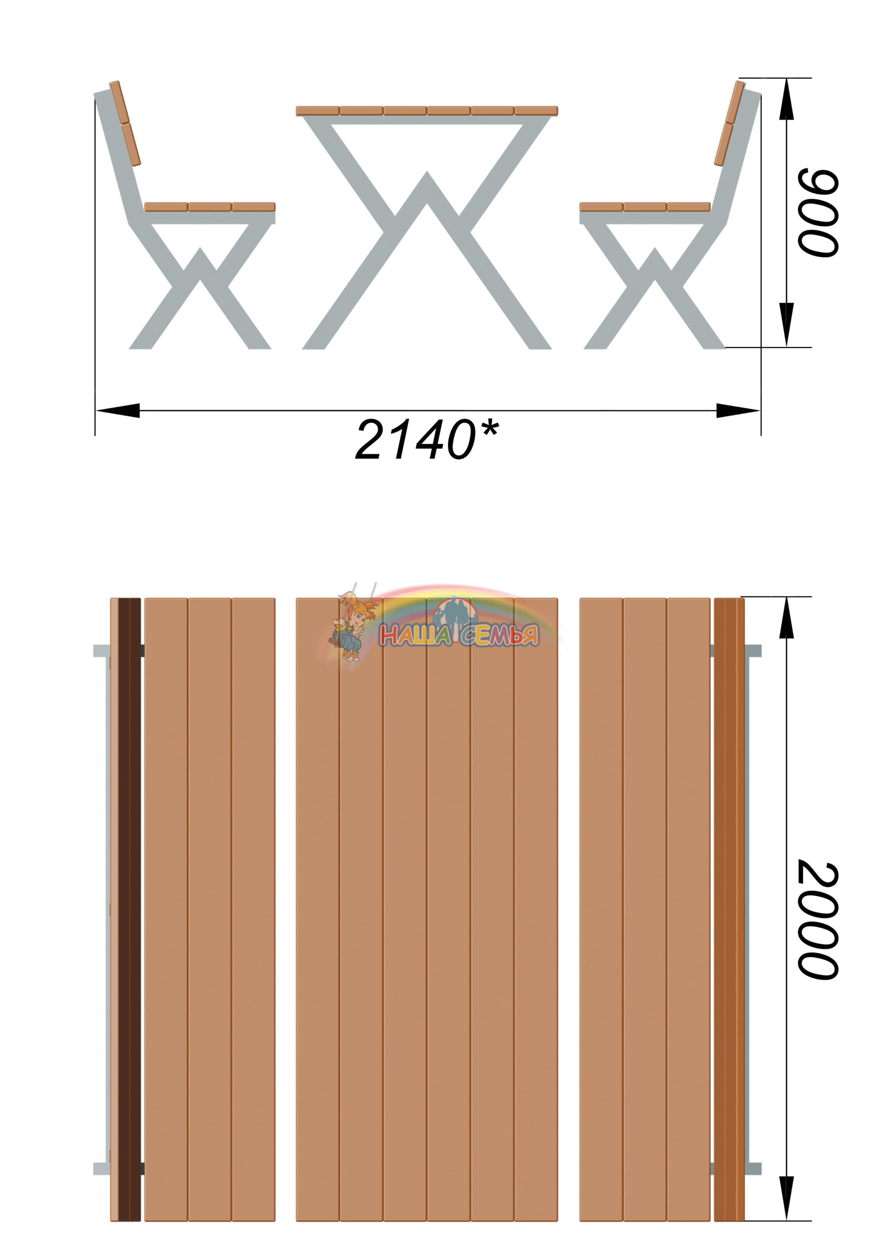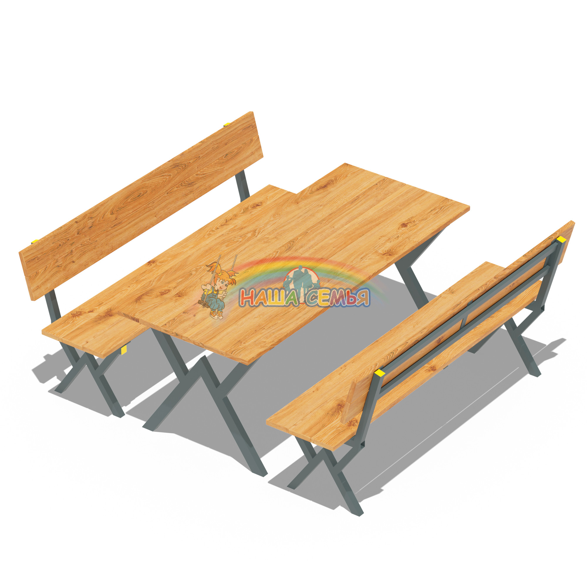Дачный комплект состоит из двух скамеек со спинками и стола. Изготовлены скамьи из деревянного бруса лиственницы, закрепленного на каркасе из металла. Каркас окрашен в коричневый цвет порошковой краской. Стол сделан из металлического каркаса и бруса лиственницы. Такой комплект пригодится на любой даче, в любом дворе жилого дома и конечно в парковой зоне.