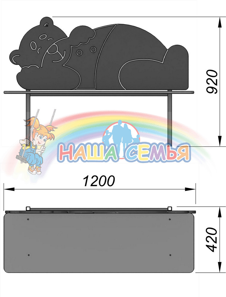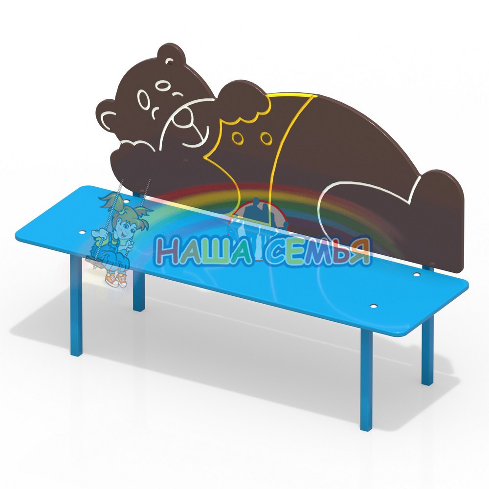 Лавочка Медведь изготовлена из влагостойкой ламинированной фанеры с металлическим каркасом. Спинка лавочки оформлена в виде спящего доброго медведя. Эта необычная лавочка обязательно привлечет к себе внимание малышей и украсит собой любую игровую площадку.