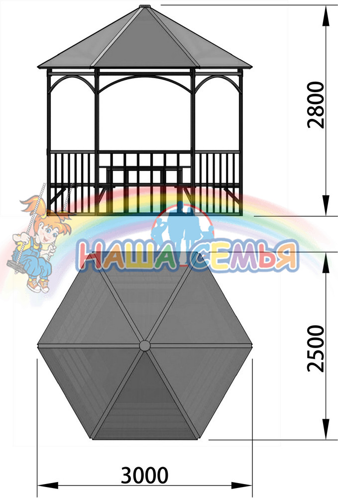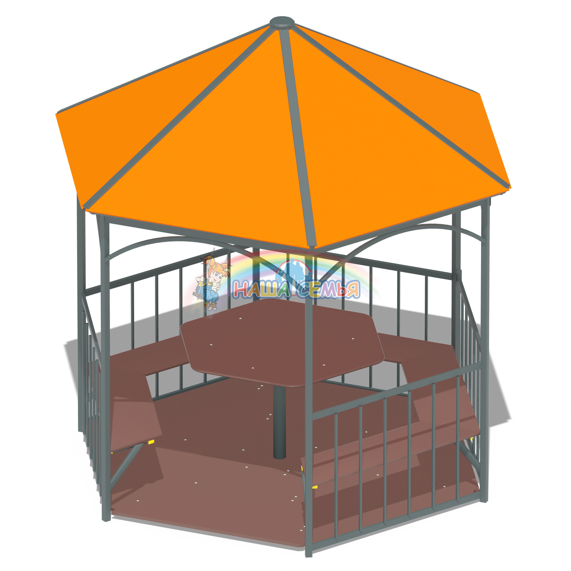 Беседка шестигранная с красной крышей и зеленым металлическим каркасом пригодится на любой детской площадке: во дворе, в садике, в школе. Дети смогут хорошо проводить здесь время. В ней есть стол и скамейки, расположенные по периметру. Малышам и ребятам постарше тут всегда найдется чем заняться. Они могут играть в беседке в настольные игры или посидеть отдохнуть, общаясь с друзьями.