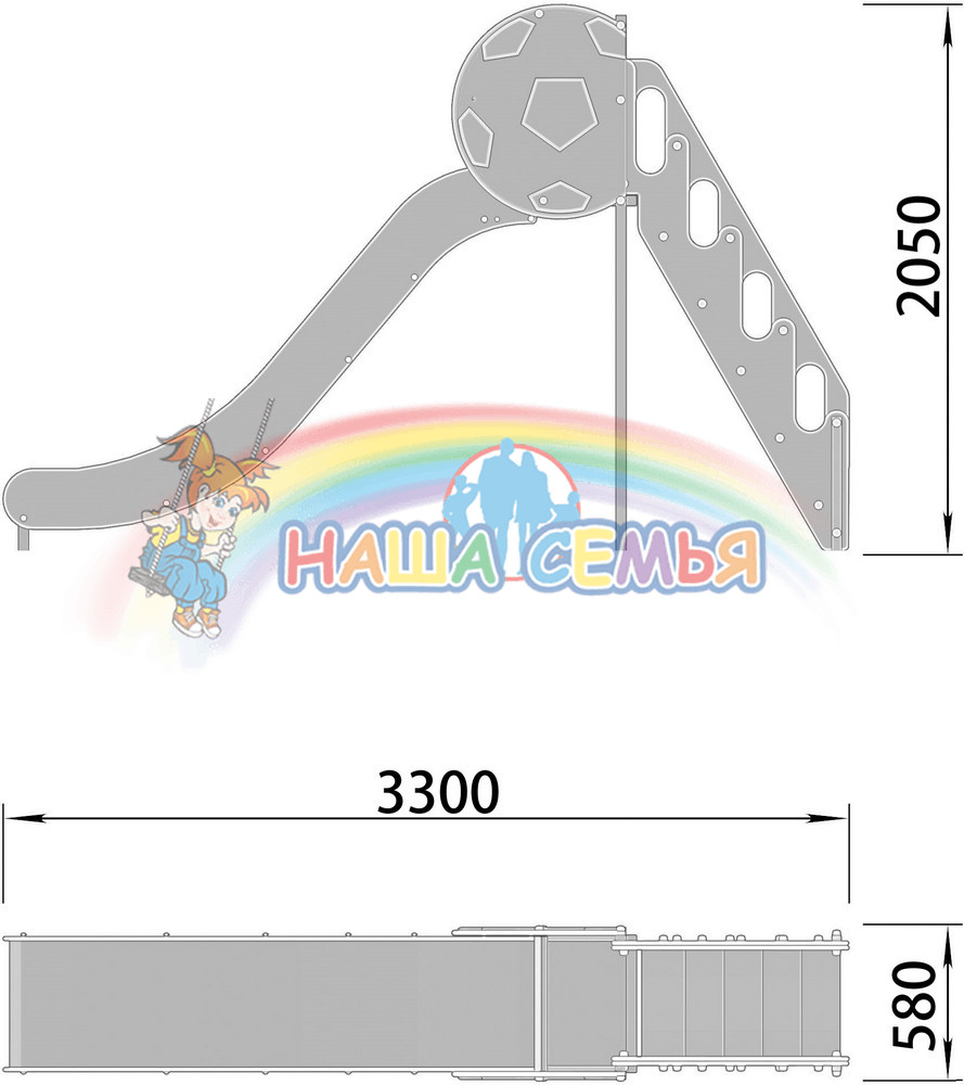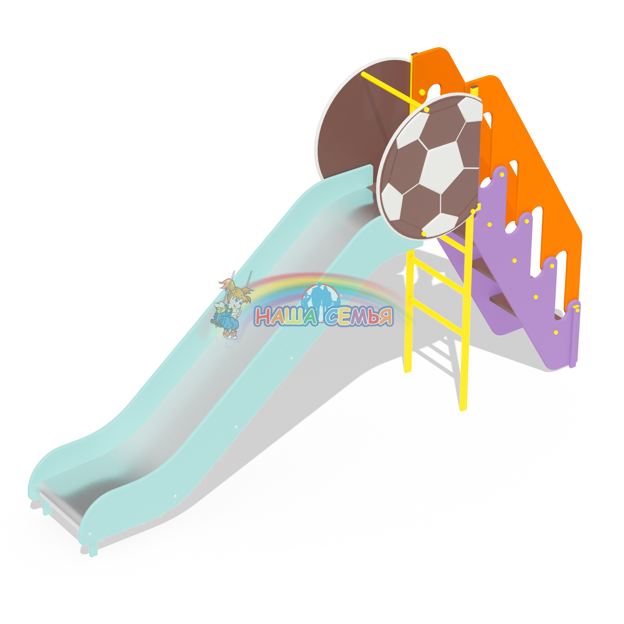 Горка выполнена в зелено-фиолетовом цвете и украшена декоративным элементом в виде футбольного мяча. Выглядит стильно и привлекательно. Эта горка всегда будет любимой забавой для детей. так же в каталоге нашей продукции вы найдете и другие аттракционы, изготовленные в этом стиле. Детская игровая площадка, оформленная элементами единого дизайна, всегда будет смотреться оригинально, стильно и интересно.