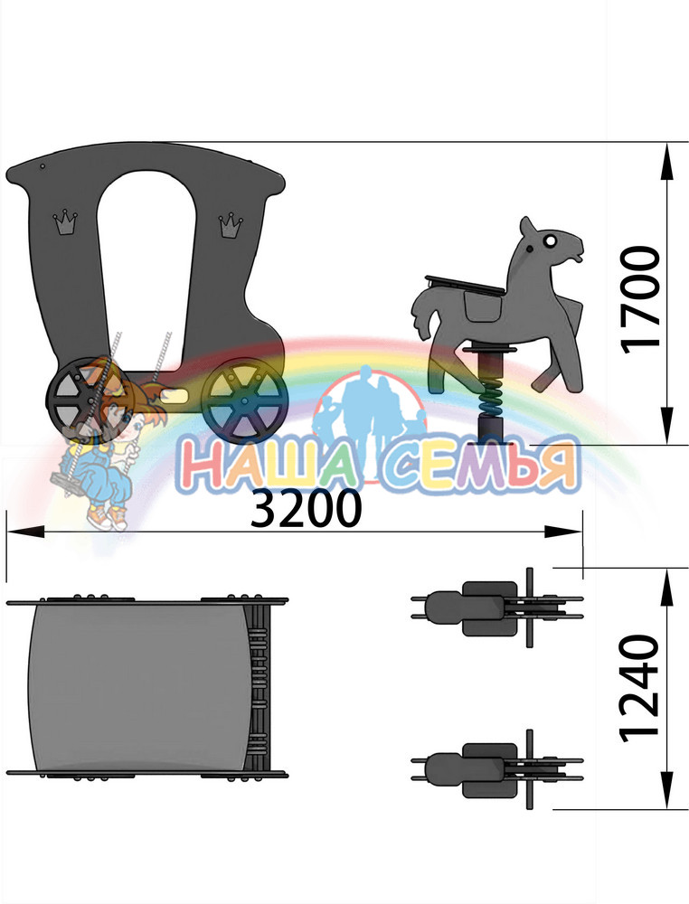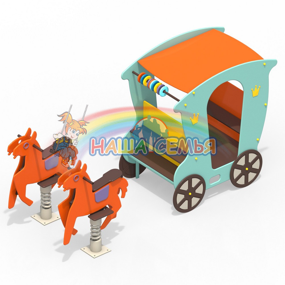 Игровое оборудование Карета с лошадками предназначено для игры одного или нескольких детей. Выполнена карета в зеленом цвете с оранжевыми и желтыми элементами. Спереди на карете находятся разноцветные счеты, а везут карету два красных скакуна. Дети с удовольствием будут играть, развивая свою фантазию, на этом игровом аттракционе.
