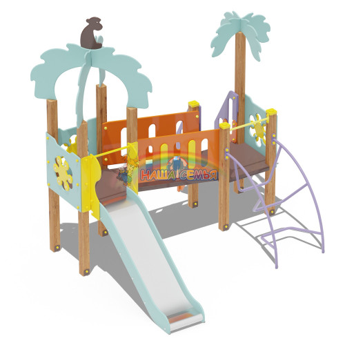 Комплекс детский Джунгли представляет собой оригинальную горку с декоративными элементами в виде пальм. На одной из пальм удобно устроилась маленькая обезьянка. Комплекс предназначен для малышей. Чтобы скатиться с горки, ребенок должен сначала подняться по лесенке, потом пройти по выпуклому мостику в джунглях, а уже потом только скатиться с горки. Элементы комплекса выполнены в зеленом, желтом и оранжевом цвете. Этот яркий детский комплекс впишется в любую детскую игровую площадку. Его оригинальный дизайн никого не оставит равнодушным. Дети будут с большим удовольствием проводить время, катаясь с такой необычной и интересной горки.