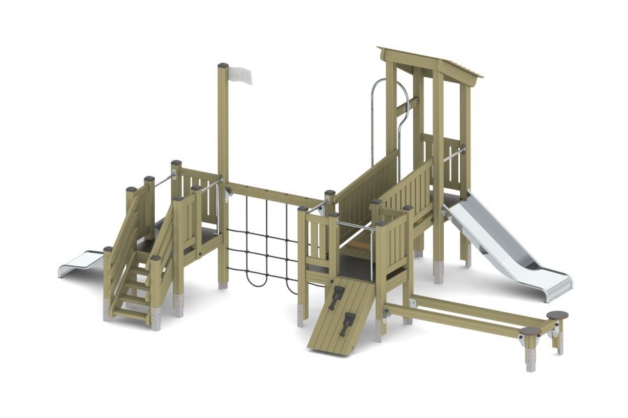 В данной категории представлены малые и средние деревянные игровые комплексы для детей от 7 до 14 лет. Городки, в которых идеально сочетается фактура древесины сосны и нержавеющая сталь. Оборудование производят из материалов с высокой прочностью и стойкостью к погодным условиям: нержавеющая сталь, все деревянные элементы имеют защитное покрытие.