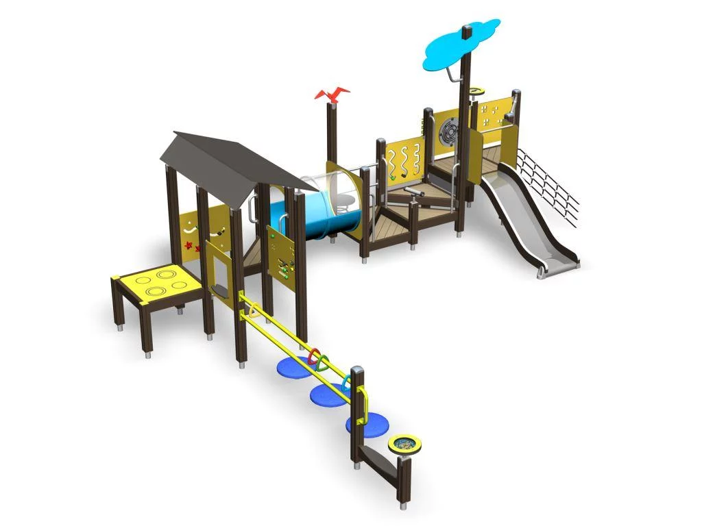 Инклюзивный игровой комплекс для малышей. Включает в себя две башни, горку, канатные сети для лазания и интерактивные игровые панели.