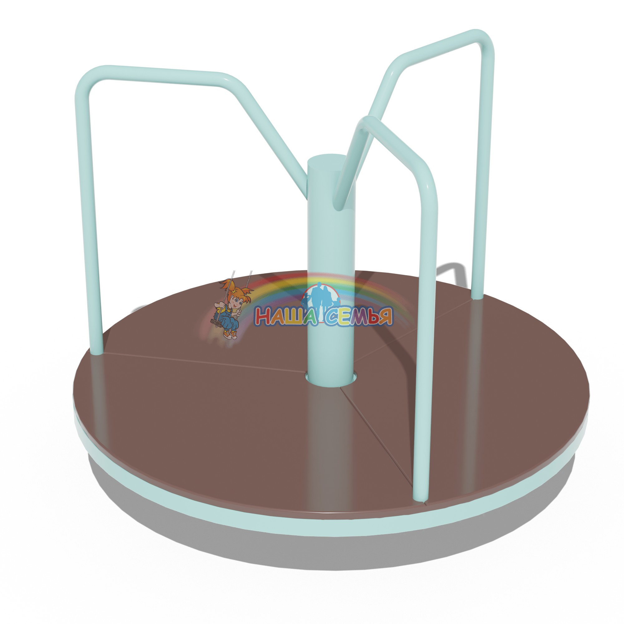 У карусели, коричневое основание и зеленые металлические поручни. На такой карусели дети смогут весело и активно проводить свое свободное время. Такая карусель развивает координацию движений, укрепляет вестибулярный аппарат. Установка такой уличной карусели на детской площадке или в детском саду, прекрасный способ организовать досуг детей с пользой для их здоровья.