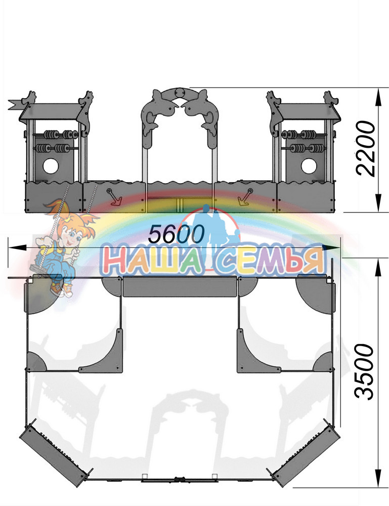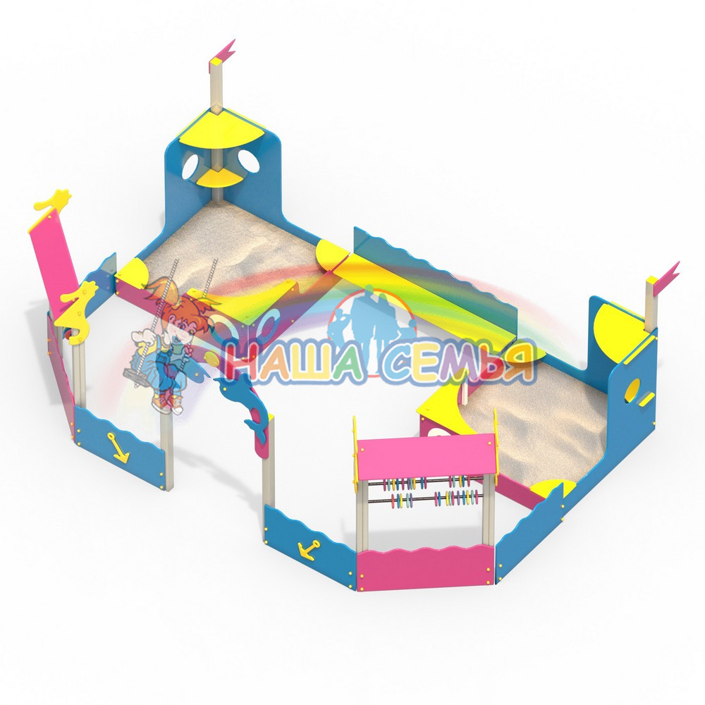 Песочный дворик Океан состоит из игровых элементов разного характера: в нем есть и две песочницы, оформленные в виде стилизованных корабликов, и разноцветные забавные счеты, и оригинальная скамейка со спинкой. Раскрашен песочный дворик в яркие цвета. Вход оформлен в виде арки с рыбками. Такой красивый и интересный игровой комплекс с песочницами непременно понравится ребятам и впишется в любую детскую игровую площадку: во дворе или детском саду.