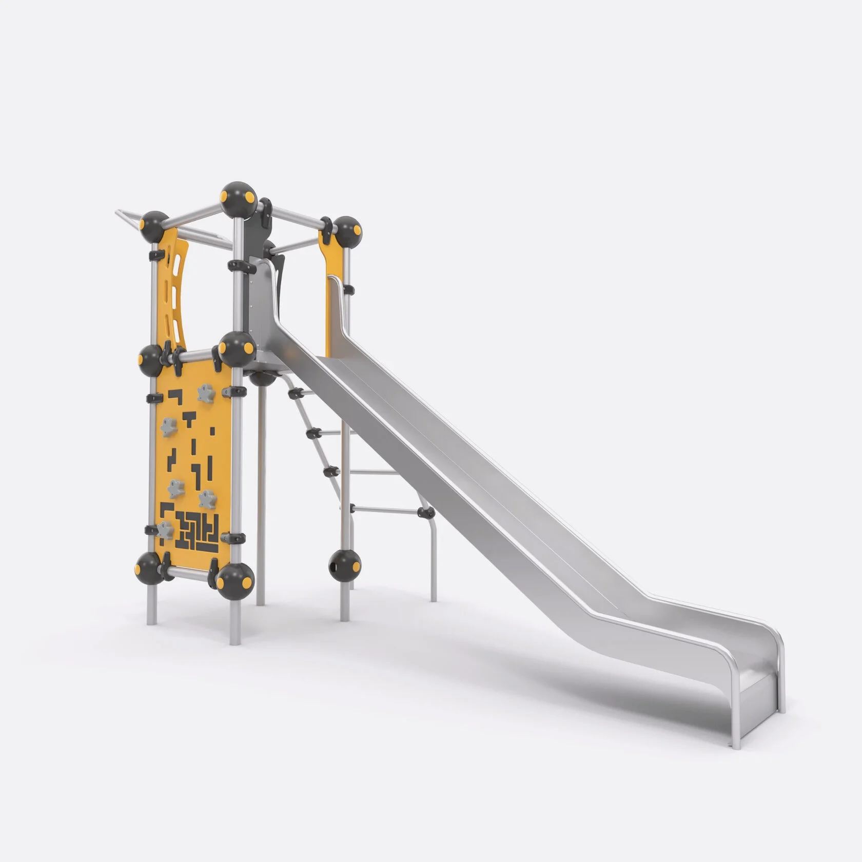 Конструкция изготовлена из следующих материалов: трубы из нержавеющей (оцинкованной) шлифованной стали марки AISI 304 диаметром 57х3 мм; канат армированный 6-прядный диаметром 16 мм – из полипропиленовых нитей и стальной проволоки. Крепления для листового HDPE-пластика к трубе круглого сечения диаметром 57 мм, крепления для каната диаметром 16 мм к трубе круглого сечения диаметром 57 мм и сферические соединители для труб диаметром 57 мм сделаны из стеклонаполненного полиамида; Х-образные и Т-образные соединения каната – из полиамида ПА6; боковые панели комплекса – из HDPE-пластика толщиной 15 мм. Пол комплекса и ступени лестницы сделаны из HDPE-пластика толщиной 15 мм с резиновой нескользящей поверхностью; горка – из нержавеющей стали марки AISI 304 толщиной 2 мм. Скалодромные зацепы – из искусственного камня на основе полиэфирной смолы и кварца, армированы стекловолокном.