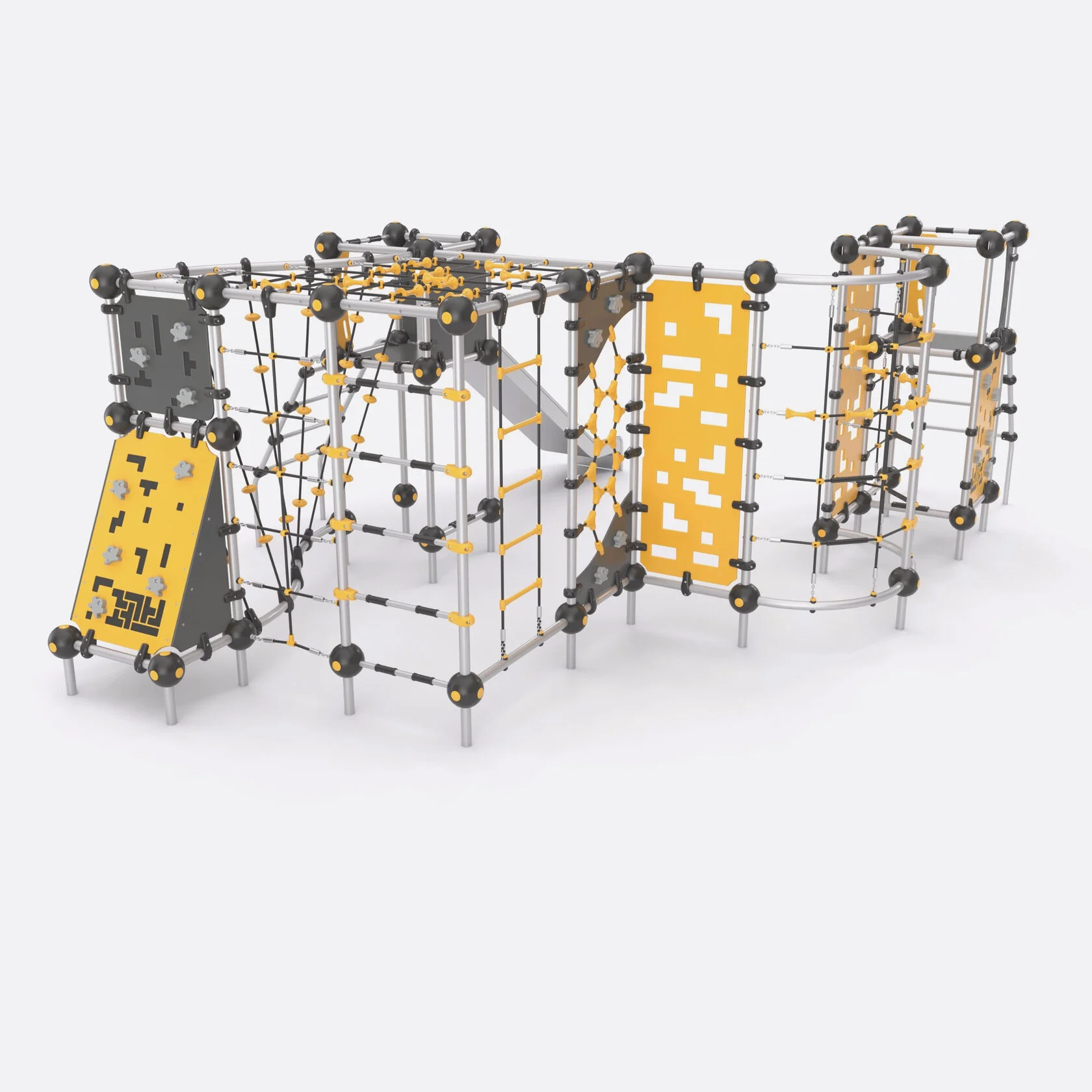 Конструкция изготовлена из следующих материалов: трубы из нержавеющей (оцинкованной) шлифованной стали марки AISI 304 диаметром 57х3 мм; канат армированный 6-прядный диаметром 16 мм – из полипропиленовых нитей и стальной проволоки. Крепления для листового HDPE-пластика к трубе круглого сечения диаметром 57 мм, крепления для каната диаметром 16 мм к трубе круглого сечения диаметром 57 мм и сферические соединители для труб диаметром 57 мм сделаны из стеклонаполненного полиамида; Х-образные и Т-образные соединения каната – из полиамида ПА6; боковые панели комплекса – из HDPE-пластика толщиной 15 мм. Пол комплекса и ступени лестницы сделаны из HDPE-пластика толщиной 15 мм с резиновой нескользящей поверхностью; горка – из нержавеющей стали марки AISI 304 толщиной 2 мм. Скалодромные зацепы сделаны из искусственного камня на основе полиэфирной смолы и кварца, армированы стекловолокном.