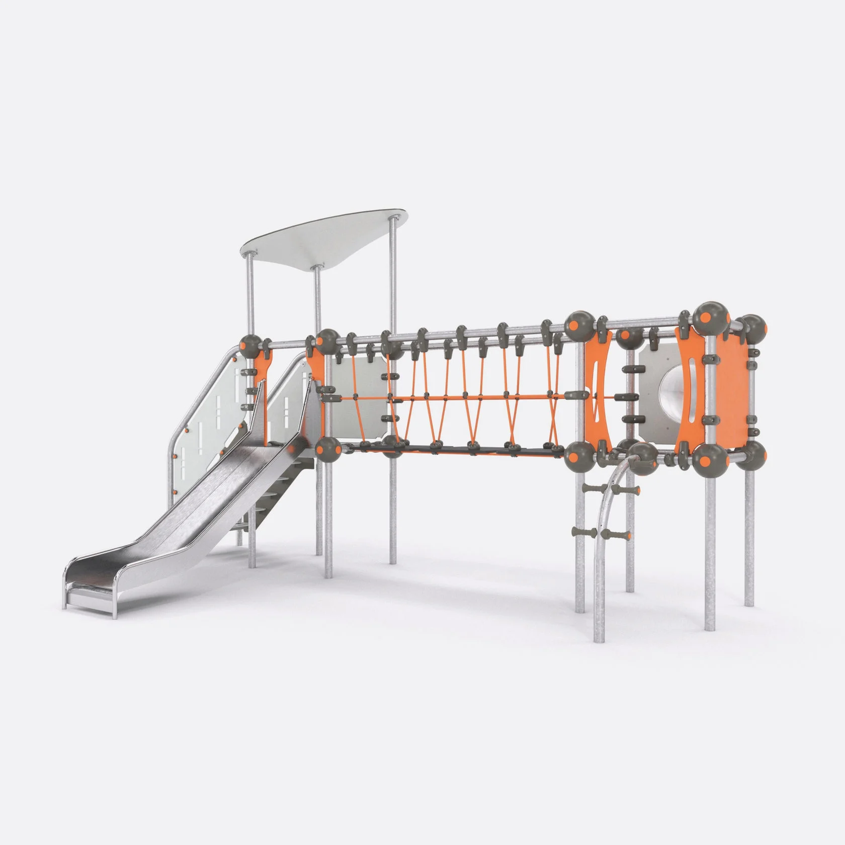 Конструкция изготовлена из следующих материалов: трубы из нержавеющей (оцинкованной) шлифованной стали марки AISI 304 диаметром 57х3 мм; канат армированный 6-прядный диаметром 16 мм – из полипропиленовых нитей и стальной проволоки. Крепления для листового HDPE-пластика к трубе круглого сечения диаметром 57 мм, крепления для каната диаметром 16 мм к трубе круглого сечения диаметром 57 мм и сферические соединители для труб диаметром 57 мм сделаны из стеклонаполненного полиамида; Х-образные и Т-образные соединения каната – из полиамида ПА6; боковые панели комплекса – из HDPE-пластика толщиной 15 мм. Пол комплекса и ступени лестницы сделаны из HDPE-пластика толщиной 15 мм с резиновой нескользящей поверхностью; горка – из нержавеющей стали марки AISI 304 толщиной 2 мм. Скалодромные зацепы сделаны из искусственного камня на основе полиэфирной смолы и кварца, армированы стекловолокном.