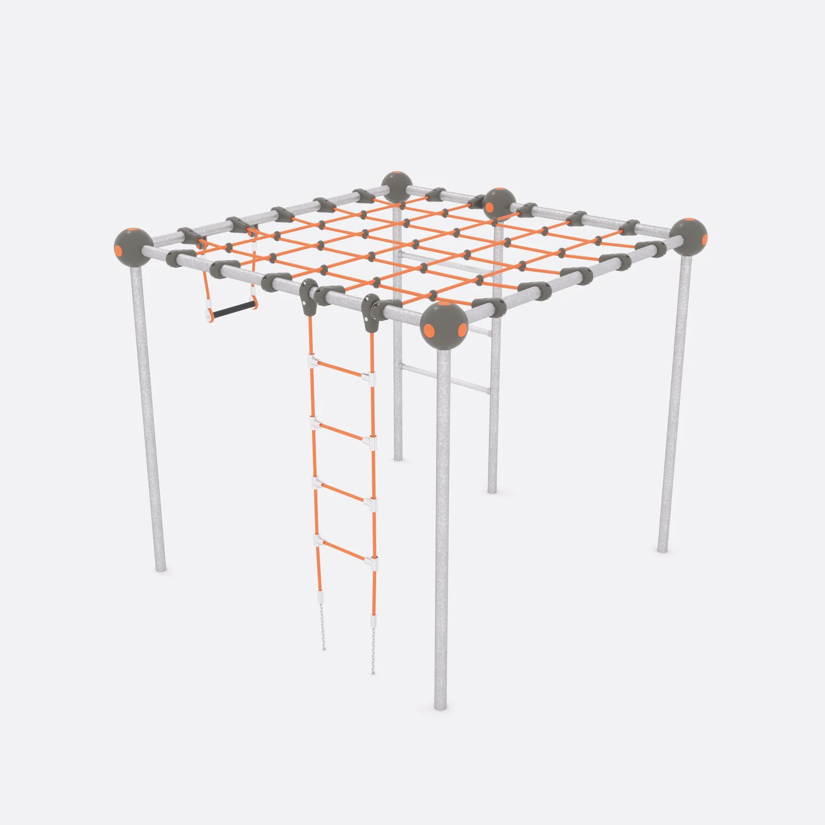 Конструкция изготовлена из следующих материалов: трубы из нержавеющей (оцинкованной) шлифованной стали марки AISI 304 диаметром 57х3 мм; канат армированный 6-прядный диаметром 16 мм – из полипропиленовых нитей и стальной проволоки. Крепления для каната диаметром 16 мм к трубе круглого сечения диаметром 57 мм и сферические соединители для труб 57 мм сделаны из стеклонаполненного полиамида. Х-образные, Т-образные соединения каната и ступени подвесной лестницы – из полиамида ПА6.