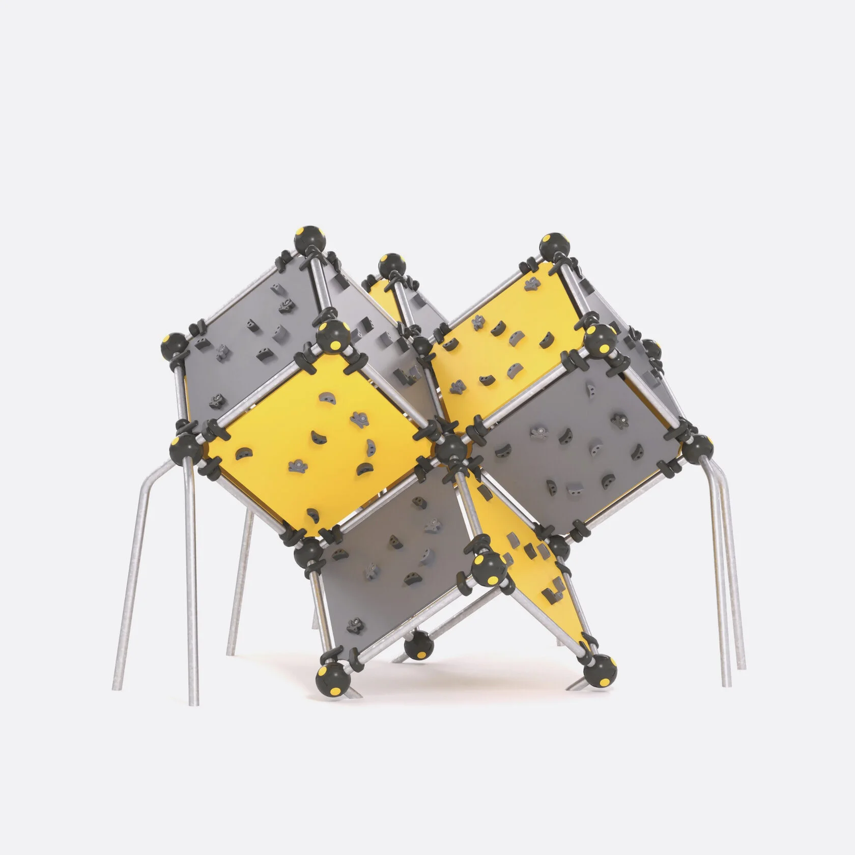 Конструкция изготовлена из следующих материалов: трубы из нержавеющей (оцинкованной) шлифованной стали марки AISI 304 диаметром 57х3 мм, крепления для листового HDPE-пластика к трубе круглого сечения диаметром 57 мм и сферические соединители для труб диаметром 57 мм – из стеклонаполненного полиамида. Боковые панели комплекса сделаны из HDPE-пластика толщиной 15 мм, скалодромные зацепы – из искусственного камня на основе полиэфирной смолы и кварца, армированные стекловолокном.