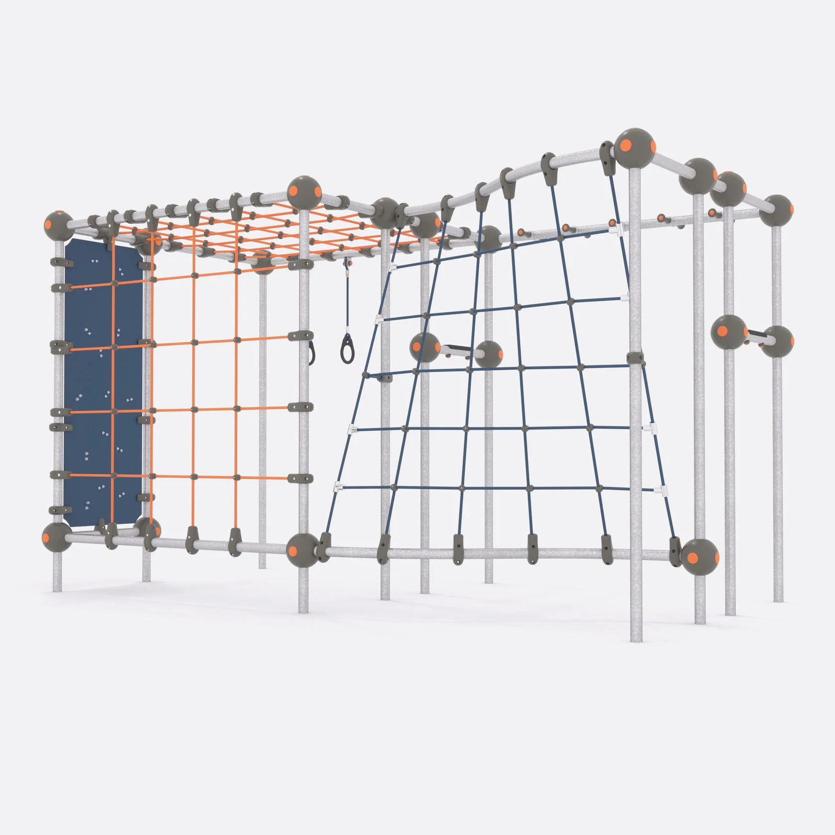 Конструкция изготовлена из следующих материалов: трубы из нержавеющей (оцинкованной) шлифованной стали марки AISI 304 диаметром 57х3 мм, канат армированный 6-прядный диаметром 16 мм – из полипропиленовых нитей и стальной проволоки. Крепления для листового HDPE-пластика к трубе круглого сечения диаметром 57 мм, крепления для каната диаметром 16 мм к трубе круглого сечения диаметром 57 мм и сферические соединители для труб диаметром 57 мм сделаны из стеклонаполненного полиамида, Х-образные и Т-образные соединения каната – из полиамида ПА6. Боковые панели комплекса сделаны из HDPE-пластика толщиной 15 мм, скалодромные зацепы – из искусственного камня на основе полиэфирной смолы и кварца, армированы стекловолокном.