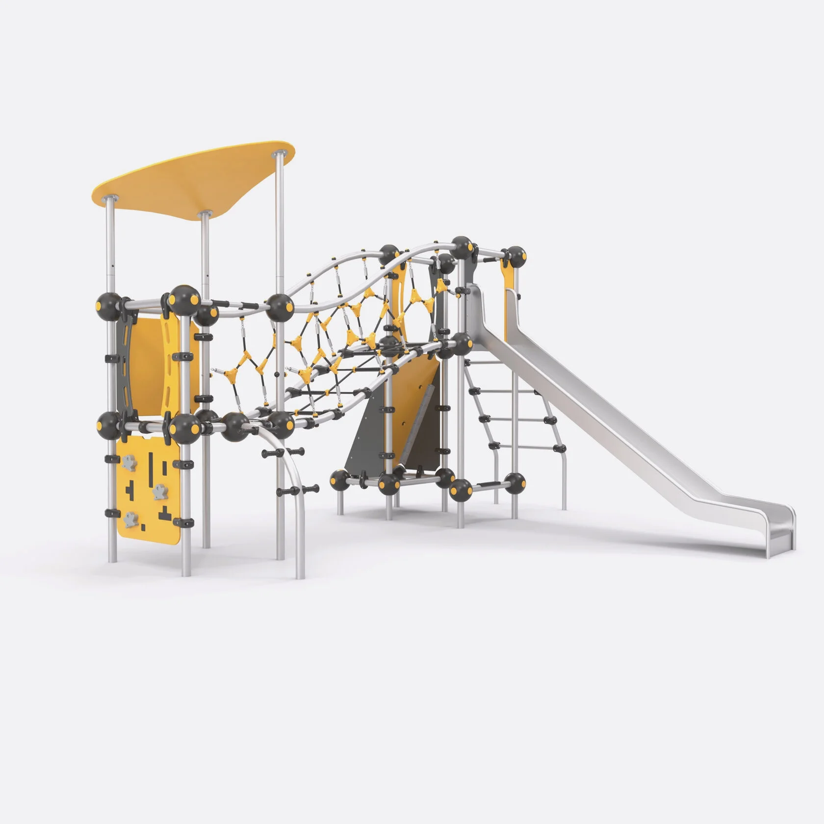 Многофункциональный комплекс для уличной площадки. Детский игровой комплекс устанавливается на открытых площадках в различных климатических зонах и рассчитан на круглогодичную эксплуатацию. Предназначен для детей от 6 до 14 лет. Включает в себя металлическую горку с прямым скатом из нержавеющей стали, несколько функциональных элементов: крыша игрового комплекса из HPL-пластика; металлическая лестница; подъем рукоходный; 2 скалодрома: вертикальный и наклонный. Панели скалодромов изготовлены из HPL-пластика. Башни комплекса соединяются канатным мостиком из армированного каната и соединителей из композитного материала. Все опорные стойки и перила изготовлены из оцинкованной стали и покрыты порошковой краской (цвет — RAL 9022). Комплекс выполнен в ярком и современном стиле. Пластиковые панели из HPL-пластика представлены в различных цветах (жёлтый, цвет мисти). Антивандальность комплекса обеспечивается использованием материалов высокого качества, безопасностью каждого элемента, бетонированием закладных при установке. Комплекс антивандальный. Безопасность игрового комплекса обеспечивается использованием материалов высокого качества, безопасностью каждого элемента, бетонированием закладных при установке. Игра на детском комплексе-полностью безопасна для ребёнка — все места соединения закрыты защитными элементами (заглушками, соединителями, колпачками), ступеньки и площадка перед горкой имеют антискользящее резиновое покрытие.