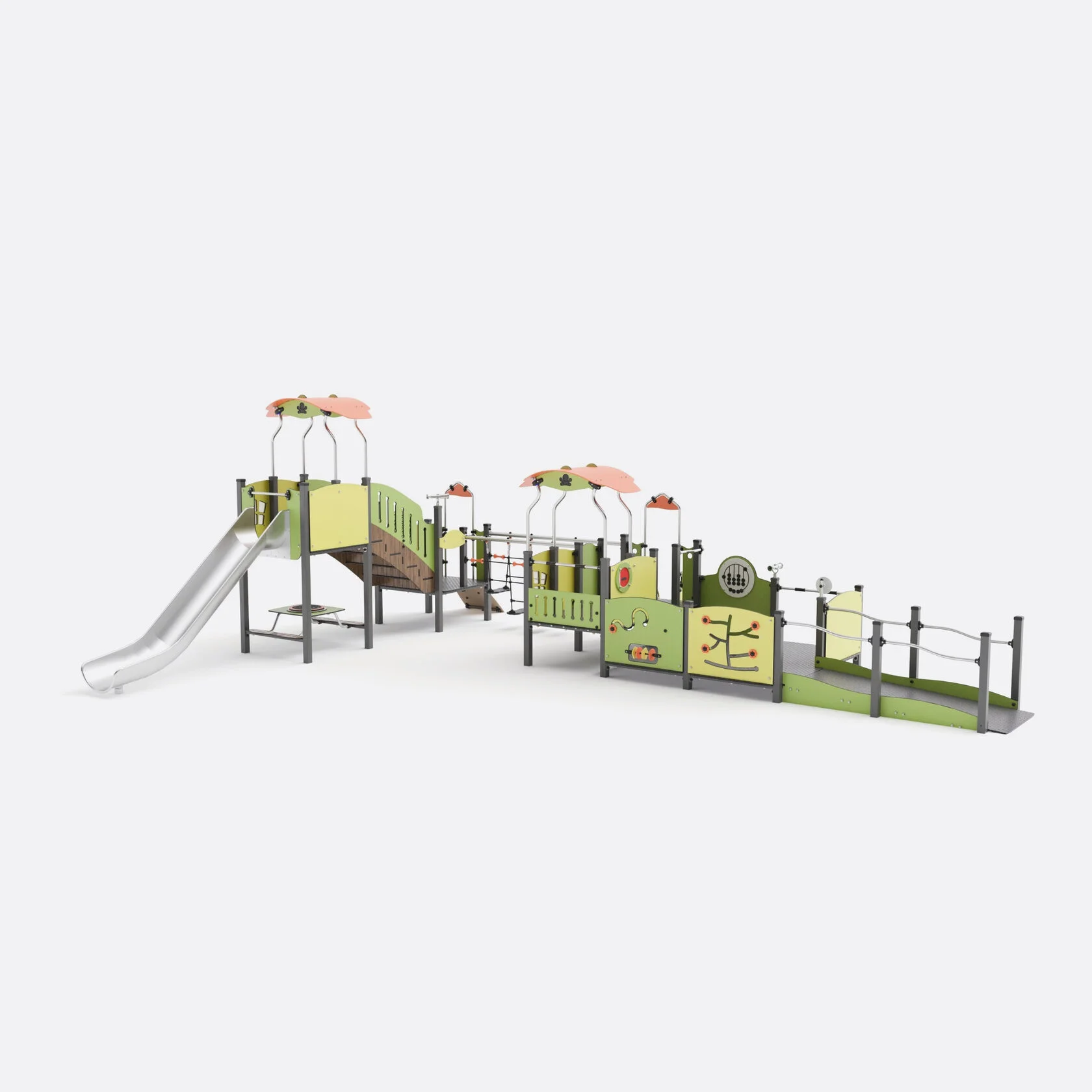 Представляет собой игровой городок для самых маленьких и активных. Он состоит из двух пространств, соединенных канатным переходом со ступенями и крышами, которые всегда укроют от дождя или палящего солнца. Также, в конструкции есть металлическая горка, телескоп, интерактивные игровые модули и малая скалодромная панель с зацепами.
