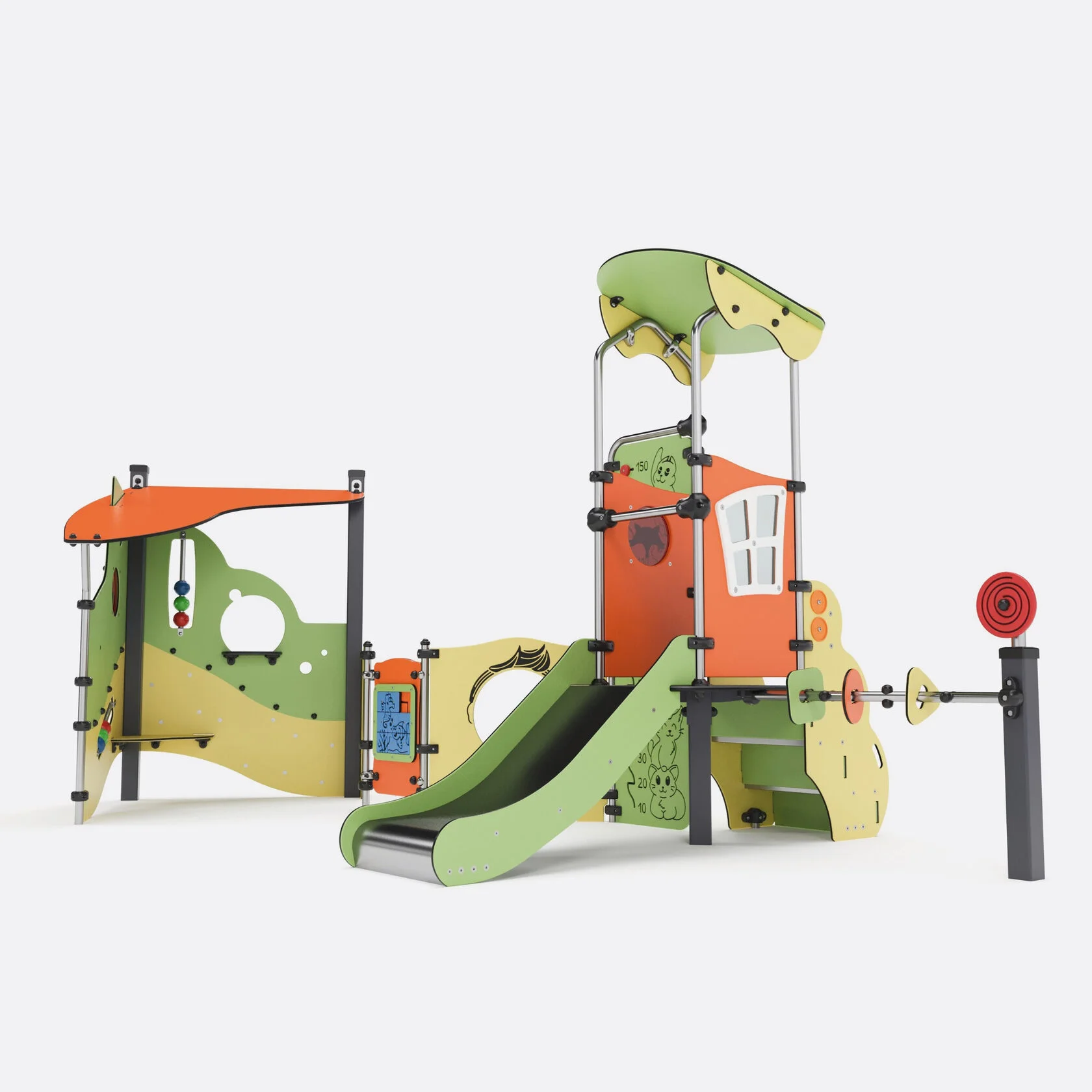 Состоит из опорных металлических стоек и пластиковых панелей. Комплекс оснащен интерактивными игровыми модулями, небольшой лестницей и малой металлической горкой с защитными бортиками. Внутри конструкции установлены угловые скамейки. Для большей безопасности, ступени лестницы с рифлёной антискользящей поверхностью.