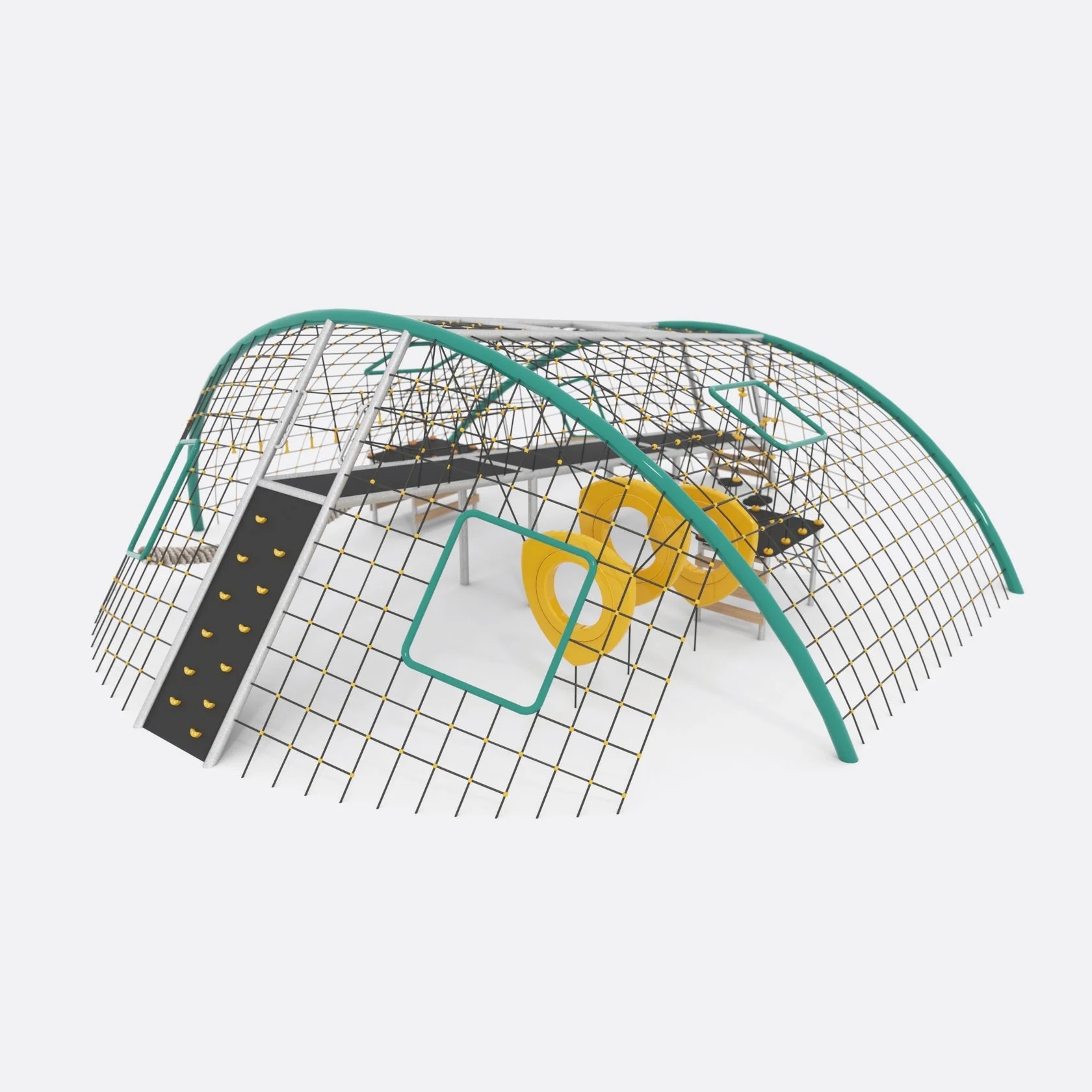 Трубы электросварные диаметром 133х4,5 мм, оцинкованные. Канат армированный шестипрядный диаметром 16 мм, состоит из полипропиленовых нитей и стальной проволоки. Х-образные и Т-образные соединения каната из полиамида ПА6. Металлические части конструкции имеют защитное порошковое покрытие. В конструкции предусмотрены игровые элемент: лазательные элементы, скалодромные панели, канатные переходы.