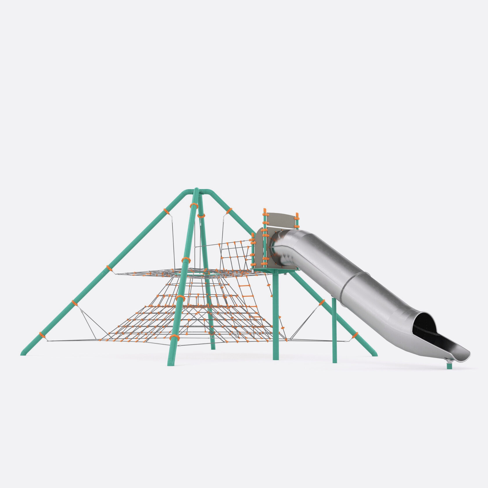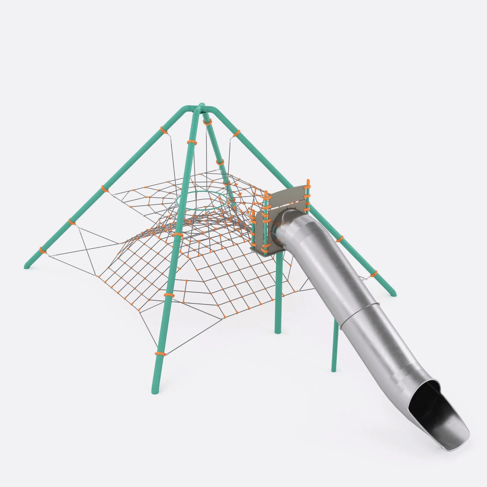 Канатная конструкция для детских игровых площадок. Металлическая рама выполнена из оцинкованных труб диаметром 133 мм с порошковым покрытием (муар), канатная часть выполнена из армированного 6-прядного каната диаметром 16 мм, соединения канатов и заглушки на торцах труб цельнолитые, выполнены из полиамида (ПА6), хомуты для крепления канатной части к раме стальные, стартовый участок горки выполнен из HDPE пластика толщиной 15 мм, хомуты для крепления HDPE пластика к раме выполнены из стеклонаполненного полиамида. Горка выполнена из листов нержавеющей стали толщиной 2 мм. Фланцы на горке закрыты декоративными накладками из HDPE пластика.