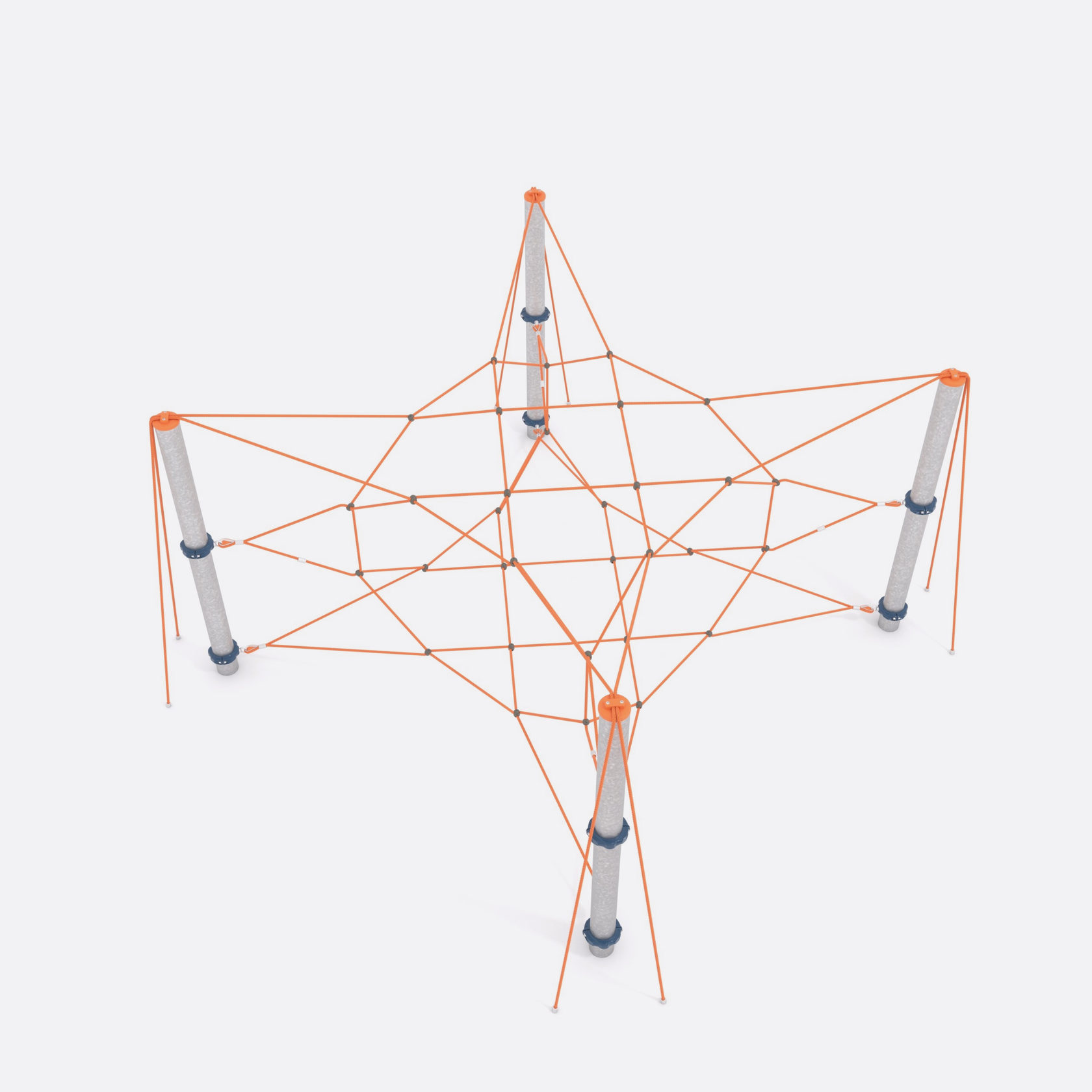 Игровая конструкция с габаритами 4130x4130x2100 мм для детских площадок. Для изготовления сетки используется полипропиленовый армированный канат диаметром 16 мм, пластиковые литые Т- и Х-образные соединители, а также стальные оцинкованные коуши и алюминиевые обжимные втулки. Канатная сетка крепится к опорным стойкам (металлические трубы Ø133 мм с толщиной стенки 4,5 мм) и натягивается с помощью талрепов. Монтаж игровой конструкции осуществляется путем бетонирования закладных элементов. Конструкция полностью укомплектована всеми необходимыми крепежными элементами и готова к установке на подготовленную поверхность. В комплект входит подробная инструкция по монтажу. Конструкция предназначена для установки на ровную поверхность, которая покрывается амортизирующим покрытием (резиновой крошкой).