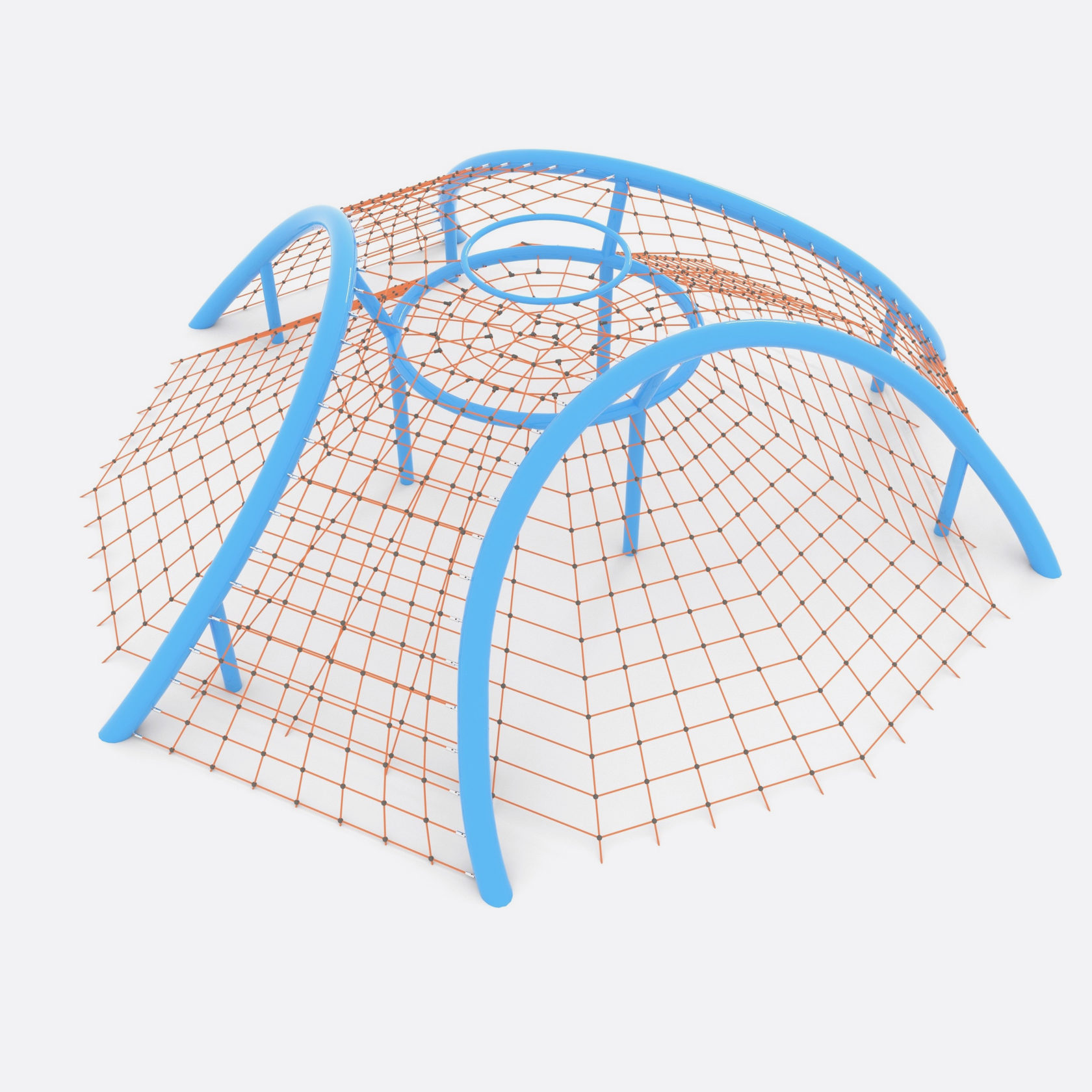 Игровая пространственная конструкция с габаритным размером 10600х10600х2600 мм, выполнена из отрезков армированного полипропиленового 6-прядного каната диаметром 16 мм, соединенных между собой в пространственную сеть при помощи алюминиевых обжимных гильз, Х-образных и Т-образных соединений из полиамида. Сетка крепится к разборной раме, выполненной из гнутых стальных труб диаметром 133 мм, при помощи специальных алюминиевых коннекторов, места стыка труб закрыты специальными стальными кожухами. Металлические части конструкции имеют защитное порошковое покрытие. Конструкция самостоящая, монтаж осуществляется на заранее подготовленные бетонные блоки при помощи анкеров.