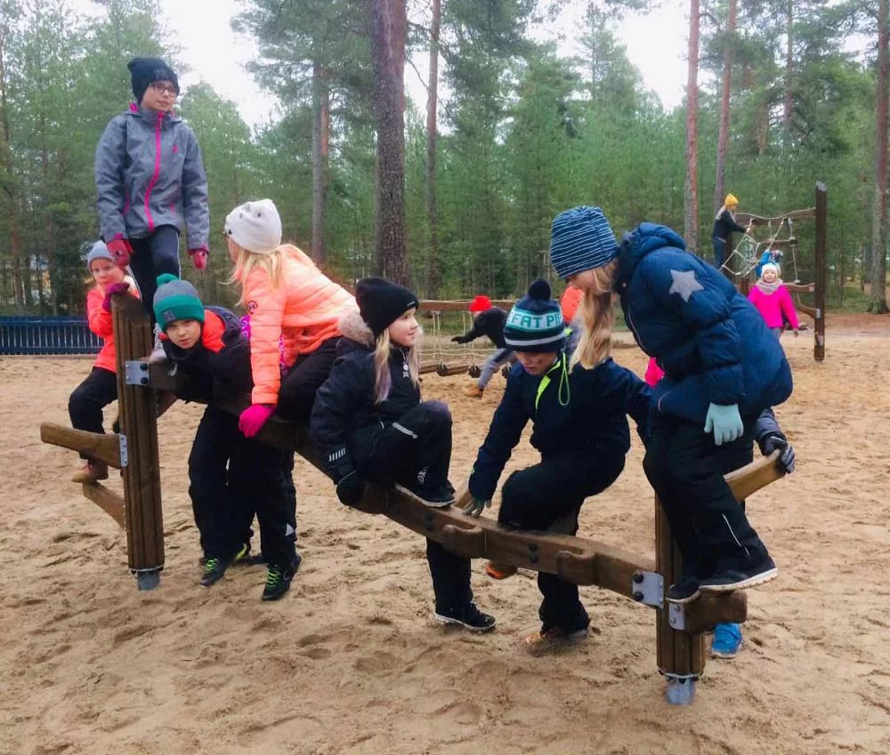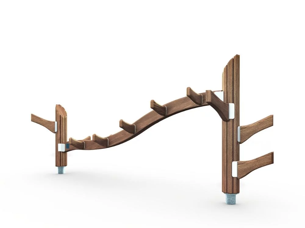 Балансировочная дорожка для детских площадок, выполненная в эко-стиле: волнообразная балка из высокопрочного дерева с десятью ветвями для лазания.