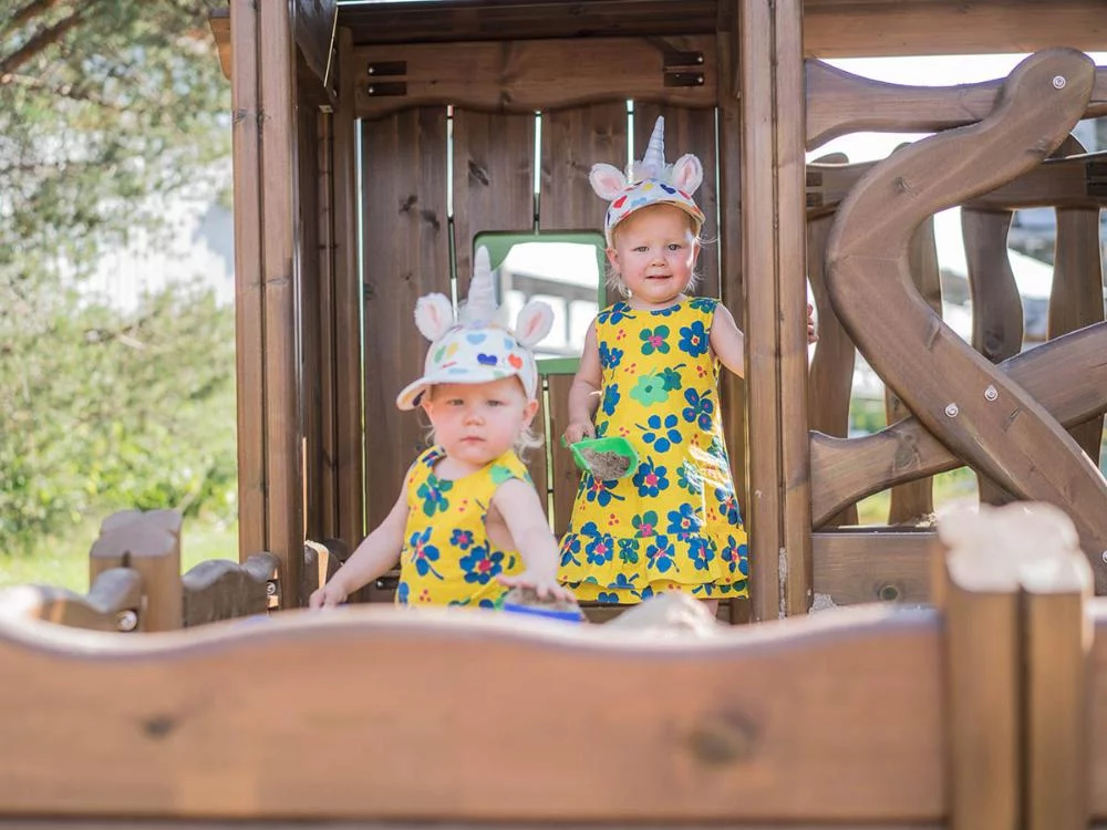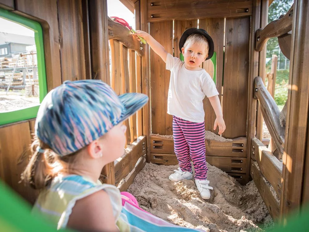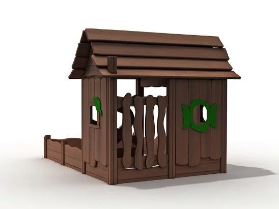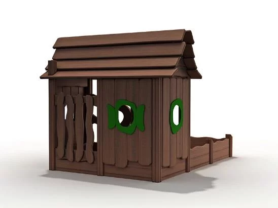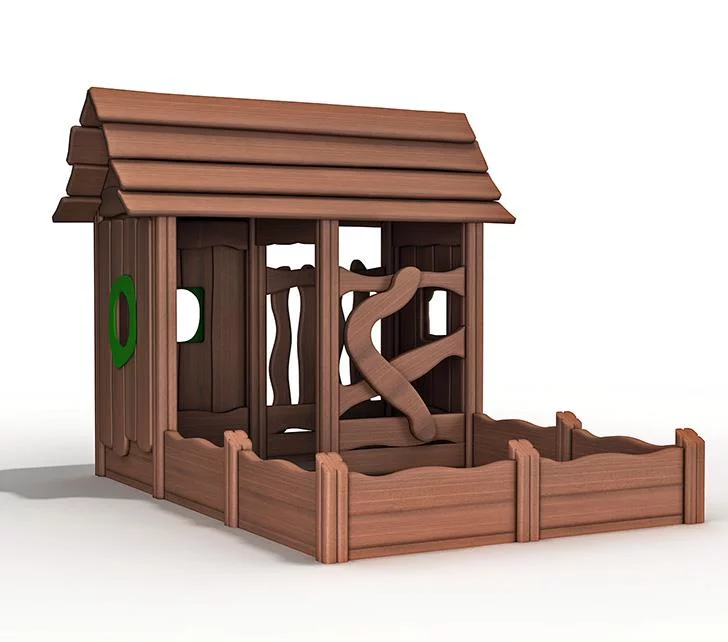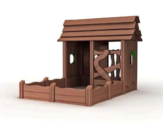 Игровой домик из натурального дерева, выполненный в скандинавском эко-стиле, с встроенной песочницей.