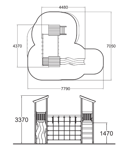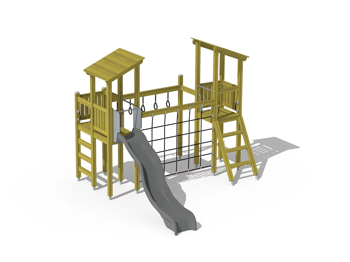 Игровой комплекс из натурального дерева с двумя башнями (с навесами от непогоды), лестницами, горкой, подвесными кольцами и канатными сетями для активного отдыха.