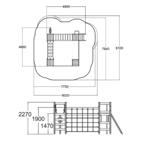 Масштабный игровой комплекс для лазания и спорта, выполненный из прочного дерева. Включает четыре игровые башни, соединенные канатными переправами, подвесным мостиком и рукоходом.