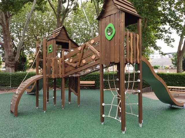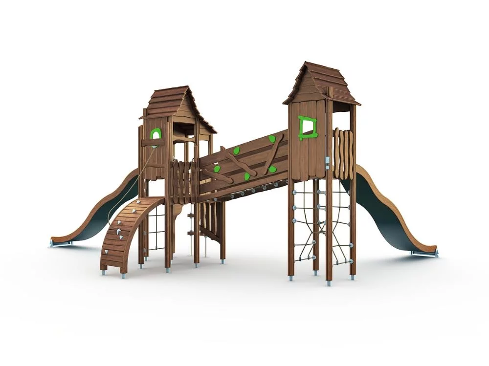 Представляем вашему вниманию игровой комплекс в эко-стиле, выполненный из натурального дерева. Он включает в себя две башни с навесами, защищающими от солнца и осадков, и оборудованные открытыми горками для веселых спусков. Для захватывающих игр предусмотрены наклонная и канатная горки, а также соединяющий башни мостик-переправа.