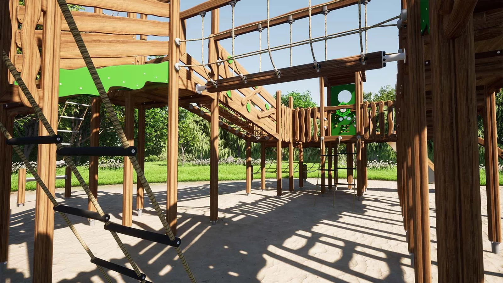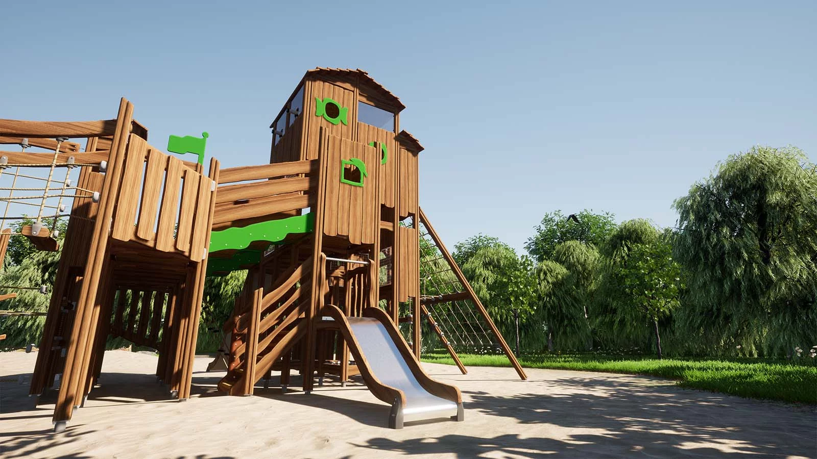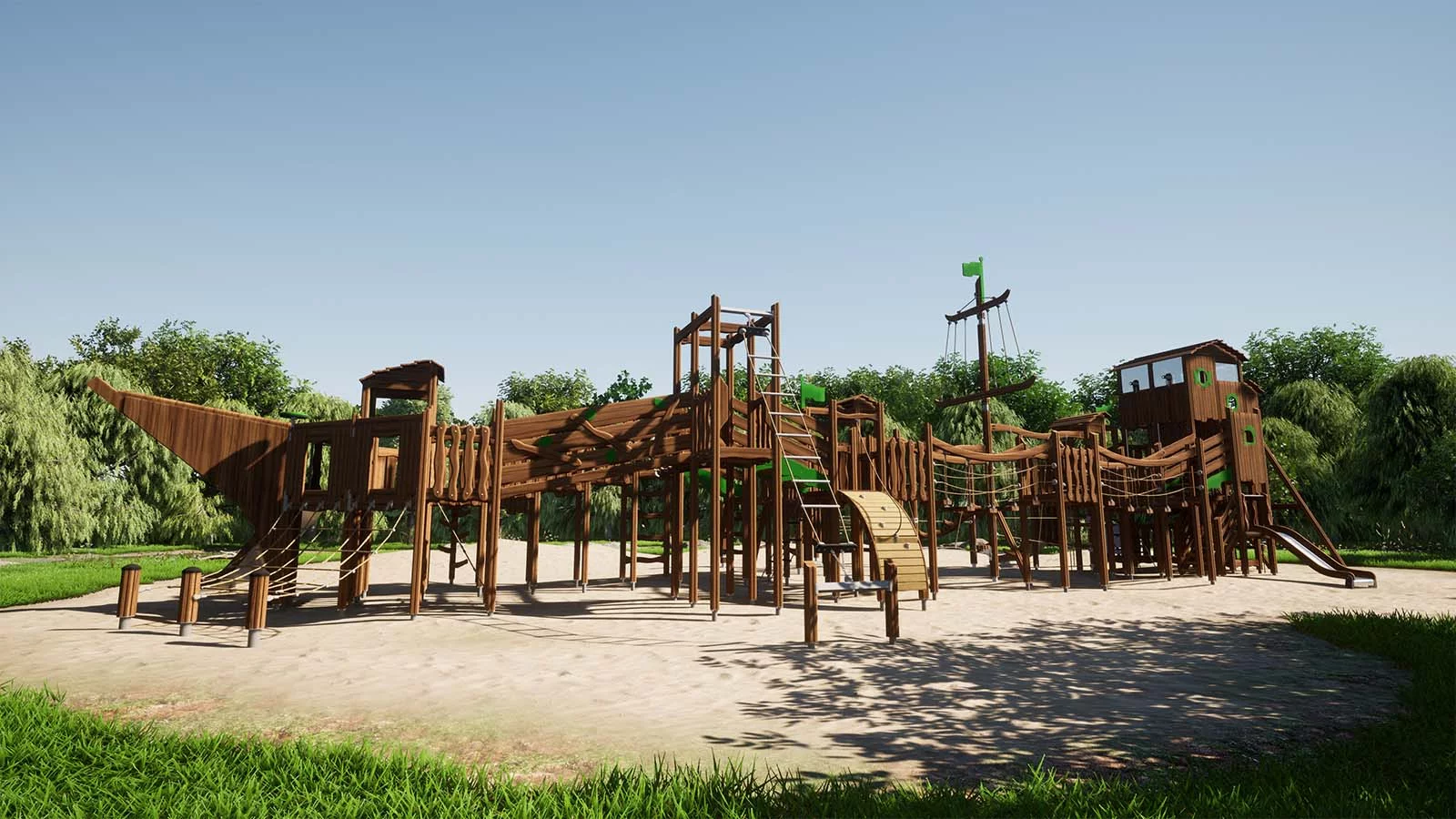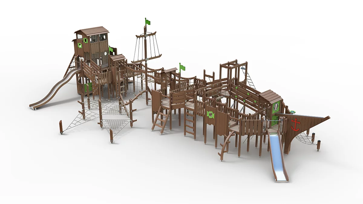 Созданный в эко-стиле, этот захватывающий игровой комплекс представляет собой большой пиратский корабль. Его дизайн включает характерный нос, якорь и высокую корму с капитанской каютой. Изготовленный из натурального дерева, комплекс дополнен канатами, мачтой с флагами и яркими элементами, создающими атмосферу морских приключений. Детская площадка предлагает широкий спектр игровых активностей: горки, лестницы, мостики и зоны для лазания, позволяющие детям полностью погрузиться в мир пиратских приключений.
