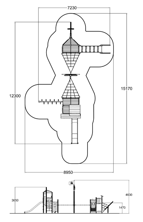 Этот игровой комплекс, выполненный в пиратской стилистике, сочетает в себе прочность клееного бруса и влагостойкость фанеры. Он включает башню-форт с горкой из нержавеющей стали, центральную мачту и сложную систему веревочных мостов, трапов и сеток для лазания. Все деревянные элементы обработаны для защиты от погодных условий, а канаты отличаются повышенной износостойкостью. Игровой комплекс рассчитан на интенсивное использование и способствует развитию у детей ловкости, баланса и координации движений.