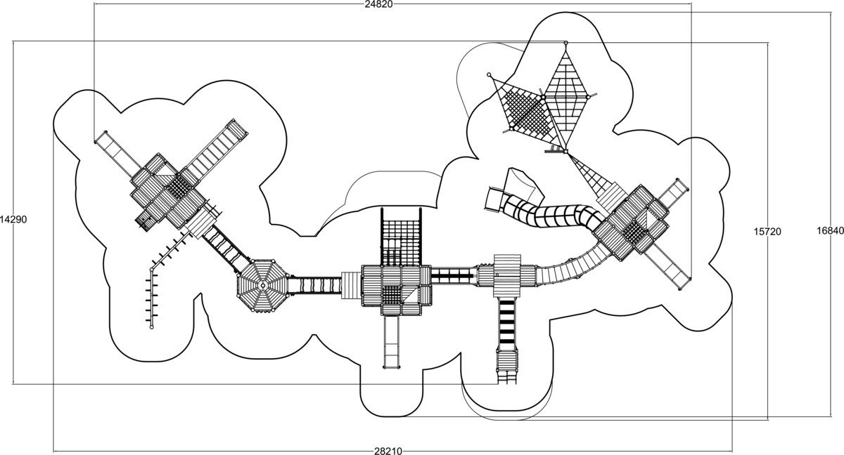 Этот масштабный игровой комплекс, выполненный в эко-стиле, воплощает собой средневековый замковый городок, состоящий из соединенных между собой деревянных башен и фортов. Конструкция, преимущественно из натурального дерева, украшена яркими зелеными акцентами на крышах и панелях. Комплекс предлагает бесконечное разнообразие игровых сценариев: здесь есть открытые и закрытые горки, мосты, сетчатые переходы и многочисленные лестницы, соединяющие все элементы воедино.