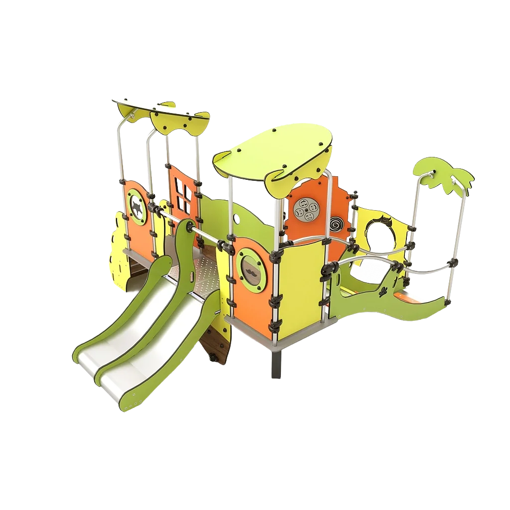 Представляет собой конструкцию, состоящую из двух параллельных металлических горок, лестницы, игровых модулей, панелей со ступенями и двух крыш, укрывающих от дождя и палящего солнца.