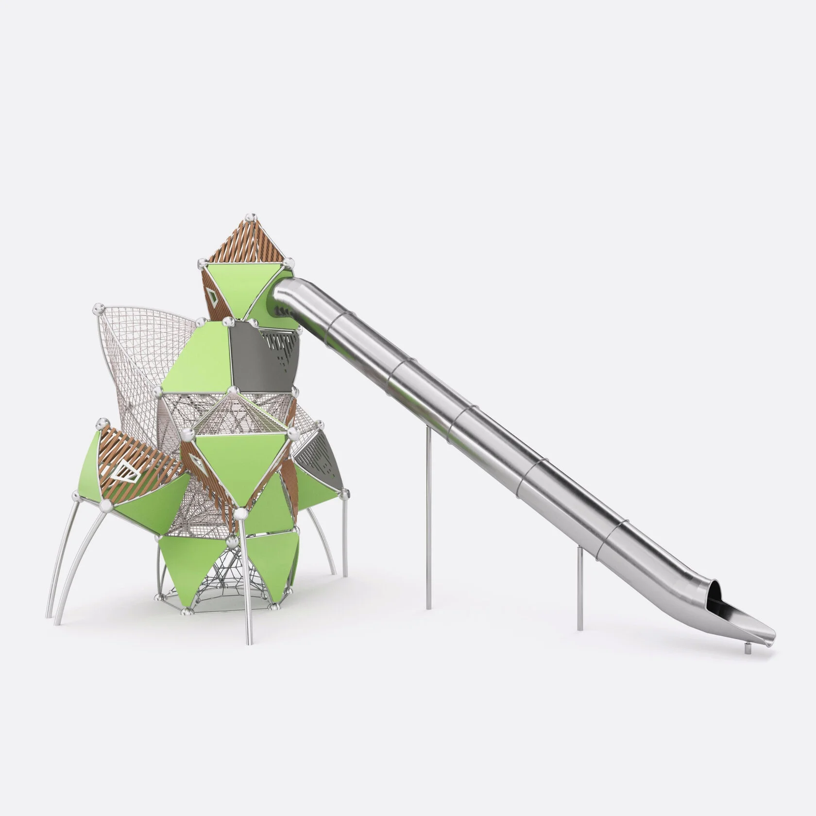 Игровой комплекс Shelby «Indy». Каркас комплекса выполнен из нержавеющих шлифованных труб диаметром 57х3 мм, марка стали AISI 304. Канатная часть комплекса выполнена из каната армированного шестипрядного диаметром 16 мм, состоящего из полипропиленовых нитей и стальной проволоки. Соединители для каната типа «клевер» выполнены из нержавеющей стали диаметром 9 мм. Боковые панели комплекса комбинированные, задняя часть панелей и оконные вставки выполнены из HDPE-пластика толщиной 15 мм, наружная часть панелей выполнена из HPL толщиной 15 мм. Каркас комплекса собран в единую структуру при помощи литых полусфер из алюминия с защитным полимерным покрытием. Отверстия в полусферах закрыты крышками из стали с полимерным покрытием. Крепления для листового HDPE и HPL к трубе круглого сечения 57 мм и крепления для каната диаметром 16 мм к трубе круглого сечения 57 мм выполнены из стеклонаполненного полиамида.