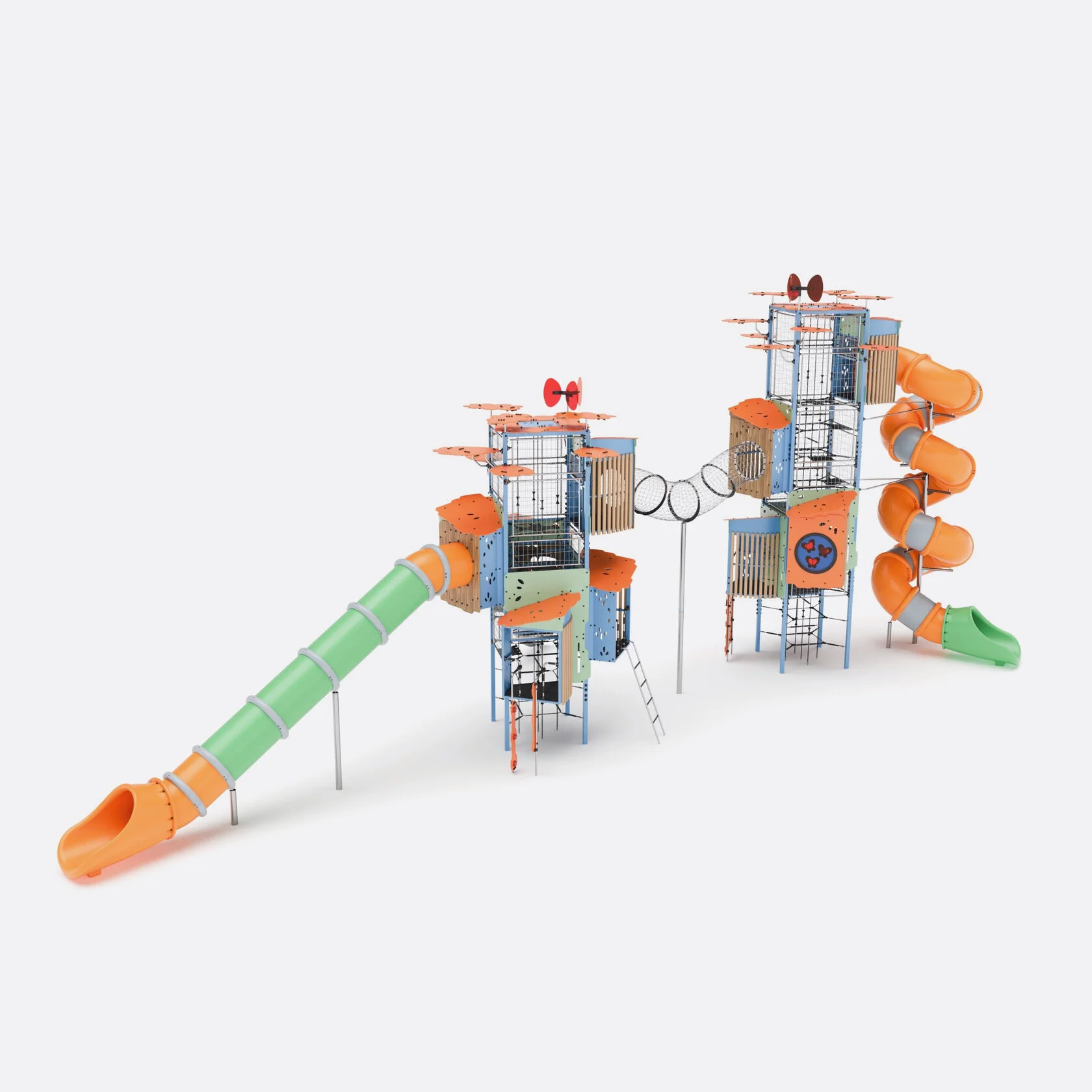 Конструкция оснащена канатными сетками с пластиковыми ручками, металлическими перекладинами, трубами-лазалками, малой скалодромной панелью с зацепами и горками: открытыми с защитными бортиками и тоннельной спиральной.