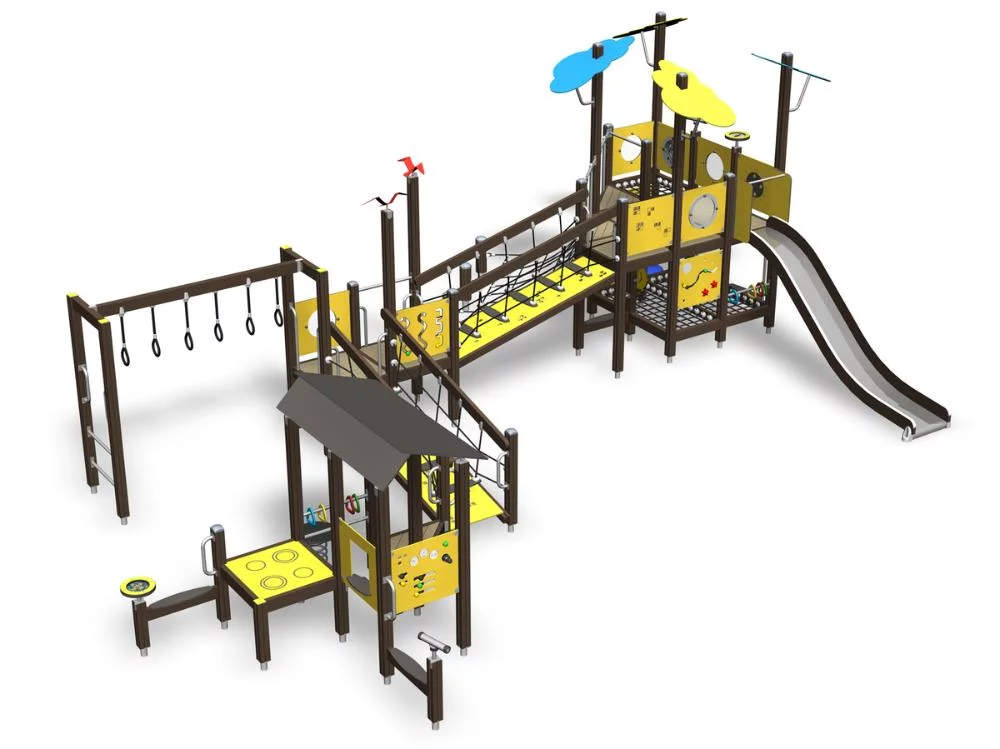 Дизайнерский игровой комплекс для младшего возраста, а также для детей с ограниченными возможностями. Оборудован горкой, подвесным мостиком, рукоходом и интерактивными игровыми панелями.