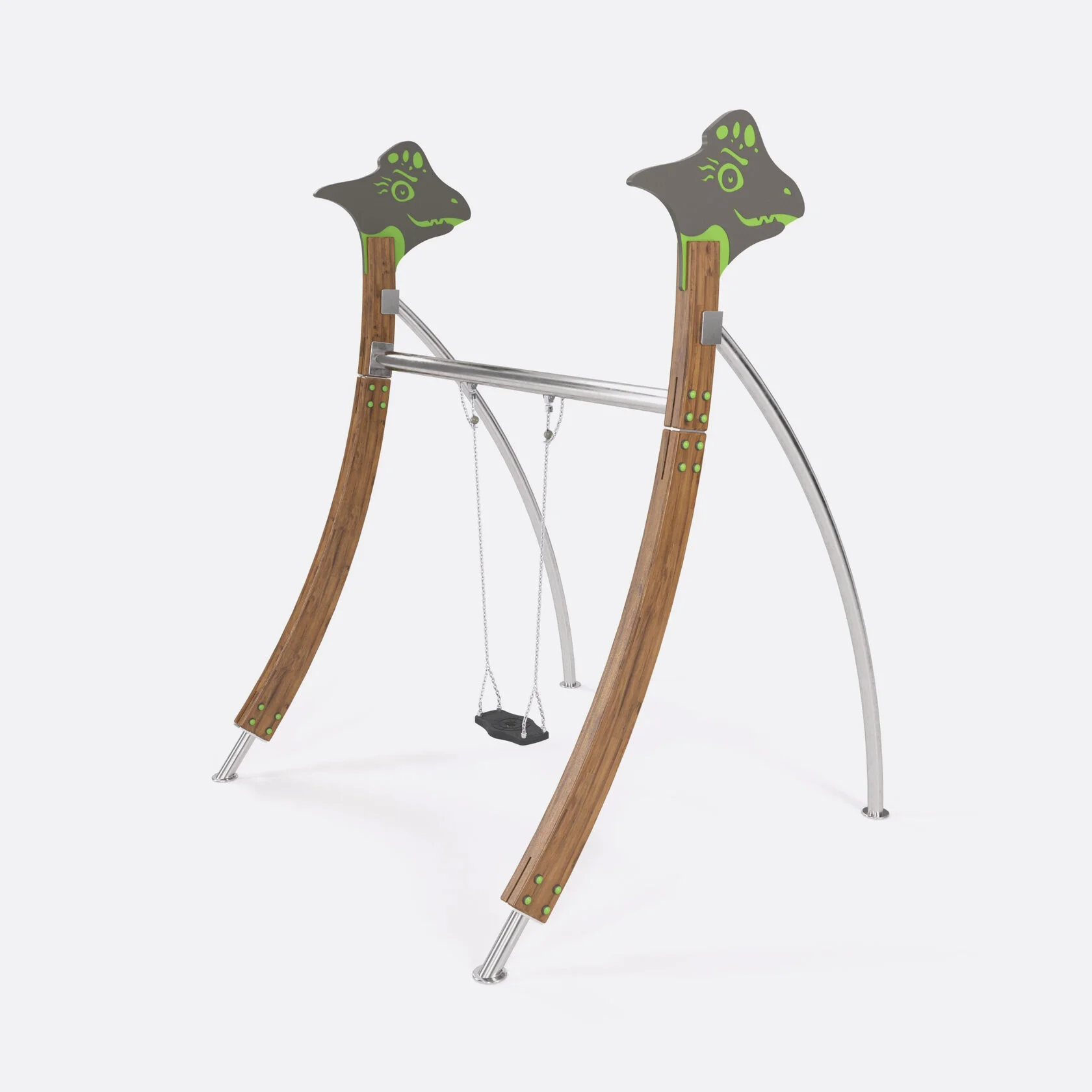 Конструкция из гнутоклеенного лиственного бруса. Трубы из нержавеющей шлифованной стали марки AISI 304 диаметром 57х3 мм. Сиденье из термоэластопласта армированного алюминиевой закладной, подвесы из нержавеющей цепи 6 мм, шарнирные крепления подвесов из нержавеющей стали.