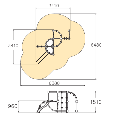 Уличный спортивно-игровой комплекс c площадкой, канатами для лазания, лестницей и зацепами для активных игр.